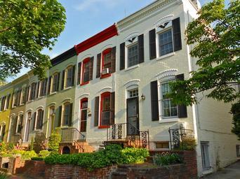 Keywords: foggy bottom washington dc houses homes condos condominiums sky clouds trees urban buildings architecture flowers plants outside summer spring