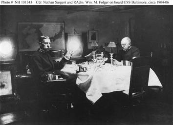 Keywords: Folger and Sergeant aboard USS Baltimore.jpg Baltimore C-3 6 <br/> United States Navy Commander Nathan Sargent left ships commanding officer and Rear Admiral William M Folger Commander Cruiser Squadron United States Asiatic Fleet in the flag cabin aboard the protected cruiser circa 1904-1905 A map of Japan Korea and the Yellow Sea is on the bulkhead behind them http //www history navy mil/photos/sh-usn/usnsh-b/c3-o htm Naval History and Heritage Command Online Library of Selected Images USS Baltimore Cruiser 3 1890-1942 -- Views on Board circa 1904 1905 Unattributed; United States Navy photograph PD-USGov-Military-Navy Original upload log en wikipedia Folger+and+Sergeant+aboard+USS+Baltimore jpg wikitable - 2012-08-06 18 37 740×535× 63005 bytes Mdnavman <nowiki> United States Navy Commander Nathan Sargent left ship ' s commanding officer and Rear Admiral William M Folger Commander Cruiser Squadron United States Asiatic Fleet in the flag cabin aboard the pr </nowiki> William M Folger |
