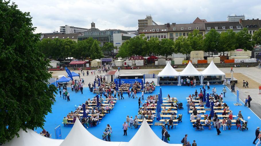 Keywords: folk festival kassel hesse germany hessian friedrichsplatz aerial view ferris wheel museum friedericianum marquee from above