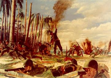 Keywords: "Follow Me!" DA Poster 21-43.png en Leyte Philippine Islands 20 October 1944 The American Army returned to the Philippines over the beaches of Leyte Island Red Beach was defended by the Japanese occupying a number of large well-camouflaged pillboxes Immediately after their landing the leading elements of the 3d Battalion 34th Infantry - one of the units of the U S Army's 24th Division - were pinned down by heavy machine gun and rifle fire The Regimental Commander Colonel Aubrey S Newman arrived on the beach and taking in the situation at a glance shouted to his men Get up and get moving Follow me News of the success of the American Forces in establishing a beachhead on Leyte - the first foothold in the Philippine Islands - was joyfully received by the American nation The President radioed congratulations to General MacArthur and added You have the nation's gratitude and the nation's prayers for success as you and your men fight your way back 2016-11-12 US Army Center of Military History DA Poster 21-43 other versions PD-USGov 24th Infantry Division United States 34th Infantry Regiment United States Battle of Leyte Military paintings |