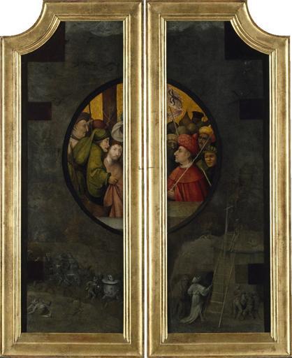 Keywords: Follower of Hieronymus Bosch - Adoration of the Magi - Upton House (closed).jpg follower of LangSwitch Hieronymus Jheronimus Bosch Christ before Pilate after the Flagellation surrounded by scenes with flying demons and a procession of fantastic figures Exterior of a triptych depicting the Adoration of the Magi See File Follower of Hieronymus Bosch - Adoration of the Magi - Upton House open jpg for the interior ~ 1495-1520 oil oak panel cm 91 4 72 9 Institution Upton House Banbury Object history by 1854 Henry Danby Seymour 1820-1877 London ProvenanceEvent 1936-01-17 sale Robert Langton Douglas -1951 Miss Seymour Knight Frank Rutley London ProvenanceEvent 1936 acquisition Vitale Bloch art dealer London ~ 1937 acquisition Walter Samuel 2nd Viscount Bearsted -1948 London /Upton House ProvenanceEvent 1948 gift LangSwitch die the au de National Trust 56479 Follower of LangSwitch Hieronymus Jheronimus Bosch Christus voor Pilatus omgeven door voorstellingen uit de hel late Other date century 15 / early Other date century 16 1480-1520 cm 91 4 72 9 Exhibition history The Bearsted Collection from Upton House Banbury 35-36 75 www nationaltrustcollections org uk http //www nationaltrustcollections org uk/ Home http //www nationaltrustcollections org uk/object/446744 Info 143 Other versions Greyscale version somewhat higher resolution File Jheronimus Bosch copyist 001 exterior 01 jpg PD-old-100 Paintings by Hieronymus Bosch Christ Before Pilate Uploaded with UploadWizard Upton House Art collection Bosch Hieronymus Closed triptychs |
