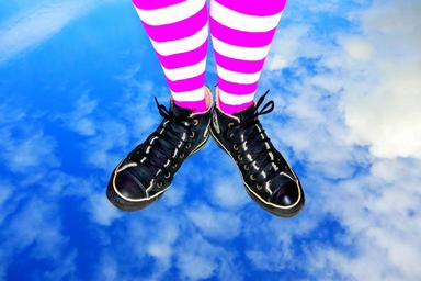 Keywords: foot leg body female people person sneakers tights stripy tights leg wear pink-white stripy tights fashion sky clouds legs in the air