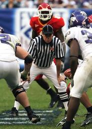 | Keywords: football american football american football game referee umpire football official sport game play team competition helmet athlete college football competitive officiating focus concentration football game officiate rules action college male line uniform whistle |