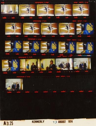 Keywords: Ford A0325 NLGRF photo contact sheet (1974-08-23)(Gerald Ford Library).jpg White House Photographic Office WHPO is housed at the Gerald R Ford Presidential Library a branch of the National Archives and Records Administration NARA <br/><br/> This file is a 200 dpi photo contact sheet having images from roll of film A0325 of the August 9 1974 - January 20 1977 Gerald R Ford White House Photographic Office Series A0001-A9999 and B0001-B2886 photographs <br/><br/> The date on the photo contact sheet is the date the roll of film was processed not necessarily the date the photographs were taken See table below for additional details 1974-08-23 Gerald R Ford Presidential Library Image http //www fordlibrarymuseum gov/library/whphotos/A0325_NLGRF jpg A0325_NLGRF jpg from http //www fordlibrarymuseum gov/library/whphotos/19740823whpo pdf White House Photographs August 23 1974 of the http //www fordlibrarymuseum gov/Library/whphotos/whpo asp White House Photographic Collection page White House Photographic Office WHPO <br/> Creator David Hume Kennerly PD-USGov Institution Institution Gerald R Ford Presidential Library Table wikitable sortable + Photo contact sheet A0325 U S President Ford Administration Gerald R Ford Library Frame s Tone Subject proper Subject generic Names Geographic Location Photographer Date - 2A Color seated at desk - horizontal GRF Oval Office Kennerly 1974-08-23 - 3A-10A Color seated at desk - vertical; reflection on desk GRF Oval Office Kennerly 1974-08-23 - 11A-17A Color seated around desk - blue eagle in foreground GRF Kissinger Oval Office Kennerly 1974-08-23 - 18A-19A Color GRF in Oval Office HAK walking GRF Kissinger Hall outside Oval Office Kennerly 1974-08-23 - 20A-22A Color standing near desk talking GRF Baroody Oval Office Kennerly 1974-08-23 Gerald R Ford Presidential Library and Museum-cooperation PD-USGov Contact sheets by the Ford White House August 1974 Photographs by David Hume Kennerly from 1974 |