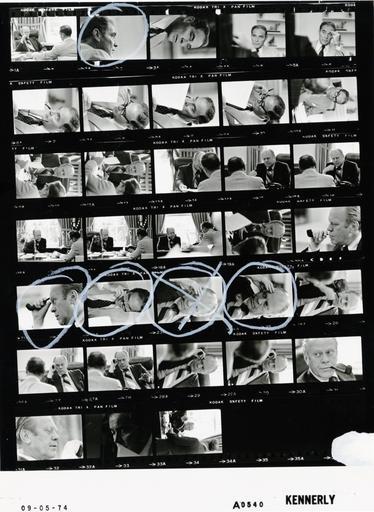 Keywords: Ford A0540 NLGRF photo contact sheet (1974-09-05)(Gerald Ford Library).jpg White House Photographic Office WHPO is housed at the Gerald R Ford Presidential Library a branch of the National Archives and Records Administration NARA <br/><br/> This file is a 200 dpi photo contact sheet having images from roll of film A0540 of the August 9 1974 - January 20 1977 Gerald R Ford White House Photographic Office Series A0001-A9999 and B0001-B2886 photographs <br/><br/> The date on the photo contact sheet is the date the roll of film was processed not necessarily the date the photographs were taken See table below for additional details 1974-09-05 Gerald R Ford Presidential Library Image http //www fordlibrarymuseum gov/library/whphotos/A0540_NLGRF jpg A0540_NLGRF jpg from http //www fordlibrarymuseum gov/library/whphotos/19740905whpo pdf White House Photographs September 5 1974 of the http //www fordlibrarymuseum gov/Library/whphotos/whpo asp White House Photographic Collection page White House Photographic Office WHPO <br/> Creator David Hume Kennerly PD-USGov Institution Institution Gerald R Ford Presidential Library Table wikitable sortable + Photo contact sheet A0540 U S President Ford Administration Gerald R Ford Library Frame s Tone Subject proper Subject generic Names Geographic Location Photographer Date - 2 BW Assistant to the President seated around desk GRF Haig Oval Office Kennerly 1974-09-05 - 3 BW Assistant to the President right side profile Haig Oval Office Kennerly 1974-09-05 - 4 BW Assistant to the President left side portrait s Haig Oval Office Kennerly 1974-09-05 - 5-6 BW Assistant to the President seated talking gesturing with hands Haig Oval Office Kennerly 1974-09-05 - 7-11 BW Assistant to the President left side portrait s ; hands moving wearing glasses Haig Oval Office Kennerly 1974-09-05 - 12-13 BW Assistant to the President seated taken over Haig's left shoulder GRF Haig Oval Office Kennerly 1974-09-05 - 14 BW Assistant to the President seated taken over Haig's right shoulder GRF Haig Oval Office Kennerly 1974-09-05 - 15-16 BW Assistant to the President seated taken over Haig's right shoulder GRF Haig Oval Office Kennerly 1974-09-05 - 17-19 BW Assistant to the President seated; GRF smoking pipe GRF Haig Oval Office Kennerly 1974-09-05 - 20 BW Assistant to the President seated; GRF smoking pipe; back of Haig's head GRF Haig Oval Office Kennerly 1974-09-05 - 21 BW Right profile smoking pipe GRF Oval Office Kennerly 1974-09-05 - 22 BW Right profile holding pipe to forehead GRF Oval Office Kennerly 1974-09-05 - 23 BW Assistant to the President head and shoulders; peering over glasses Haig Oval Office Kennerly 1974-09-05 - 24-25 BW head and shoulders; hand on head smoking pipe GRF Oval Office Kennerly 1974-09-05 - 26 BW head and shoulders; hand on chin smoking pipe GRF Oval Office Kennerly 1974-09-05 - 27-30 BW Assistant to the President holding pipe against temple GRF Haig Oval Office Kennerly 1974-09-05 - 31 BW Face; smoking pipe GRF Oval Office Kennerly 1974-09-05 - 32 BW left profile GRF Oval Office Kennerly 1974-09-05 - 33 BW Assistant to the President right profile Haig Oval Office Kennerly 1974-09-05 - 34 BW Assistant to the President GRF seated Marsh standing GRF Marsh Oval Office Kennerly 1974-09-05 Gerald R Ford Presidential Library and Museum-cooperation PD-USGov Contact sheets by the Ford White House September 1974 Photographs by David Hume Kennerly from 1974 |