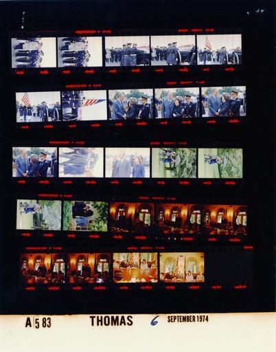 | Keywords: Ford A0583 NLGRF photo contact sheet (1974-09-06)(Gerald Ford Library).jpg White House Photographic Office WHPO is housed at the Gerald R Ford Presidential Library a branch of the National Archives and Records Administration NARA <br/><br/> This file is a 200 dpi photo contact sheet having images from roll of film A0583 of the August 9 1974 - January 20 1977 Gerald R Ford White House Photographic Office Series A0001-A9999 and B0001-B2886 photographs <br/><br/> The date on the photo contact sheet is the date the roll of film was processed not necessarily the date the photographs were taken See table below for additional details 1974-09-06 Gerald R Ford Presidential Library Image http //www fordlibrarymuseum gov/library/whphotos/A0583_NLGRF jpg A0583_NLGRF jpg from http //www fordlibrarymuseum gov/library/whphotos/19740906whpo pdf White House Photographs September 6 1974 of the http //www fordlibrarymuseum gov/Library/whphotos/whpo asp White House Photographic Collection page White House Photographic Office WHPO - Thomas PD-USGov Institution Institution Gerald R Ford Presidential Library Table wikitable sortable + Photo contact sheet A0583 U S President Ford Administration Gerald R Ford Library Frame s Tone Subject proper Subject generic Names Geographic Location Photographer Date - 3-4 Color Funeral for General Creighton Abrams - Fort Myer Virginia standing watching General Weyand Military Officers civilians Fort Myer VA Outside Fort Myer Memorial Chapel Thomas 1974-09-06 - 5-6 Color Funeral for General Creighton Abrams - Fort Myer Virginia Guard in front by caisson; others in background Honor Guard General Weyand Military Officers civilians Fort Myer VA Outside Fort Myer Memorial Chapel Thomas 1974-09-06 - 7-8 Color Funeral for General Creighton Abrams - Fort Myer Virginia Guard in front by caisson; others in background Flag Bearer Honor Guard General Weyand Military Officers civilians Fort Myer VA Outside Fort Myer Memorial Chapel Thomas 1974-09-06 - 9 Color Funeral for General Creighton Abrams - Fort Myer Virginia walking next to caisson Flag Bearer Honor Guard Fort Myer VA Outside Fort Myer Memorial Chapel Thomas 1974-09-06 - 10-13 Color Funeral for General Creighton Abrams - Fort Myer Virginia talking embracing GRF Julia Abrams Lt Col Abrams Fort Myer VA Outside Fort Myer Memorial Chapel Thomas 1974-09-06 - 14-15 Color Funeral for General Creighton Abrams - Fort Myer Virginia walking GRF Betty Ford Secret Service Fort Myer VA Outside Fort Myer Memorial Chapel Thomas 1974-09-06 - 16-18 Color Returning from funeral for Gen Creighton Abrams walking under umbrellas toward Oval Office GRF Betty Ford Bob Barrett Secret Service Walkway between Oval Office and Driveway Thomas 1974-09-06 - 19 Color Returning from funeral for Gen Creighton Abrams walking into Oval Office GRF Betty Ford O'Donnell Colonnade Thomas 1974-09-06 - 20 Color prior to meeting with Women's Group leaders GRF and Betty standing acknowledging applause GRF Betty Ford Women Cabinet Room Thomas 1974-09-06 - 21-22 Color Meeting with Women's Group leaders GRF standing Betty sitting behind GRF Betty Ford Women Cabinet Room Thomas 1974-09-06 - 23-24 Color Meeting with Women's Group leaders GRF and Betty standing by table GRF Betty Ford Women Cabinet Room Thomas 1974-09-06 - 25 Color Meeting with Women's Group leaders sitting at table - close up taken across from GRF GRF Betty Ford Women Cabinet Room Thomas 1974-09-06 - 26 Color Meeting with Women's Group leaders sitting at table - medium - taken across table GRF Betty Ford Women Cabinet Room Thomas 1974-09-06 Gerald R Ford Presidential Library and Museum-cooperation PD-USGov Contact sheets by the Ford White House September 1974 |