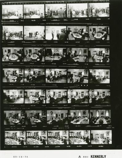 | Keywords: Ford A0881 NLGRF photo contact sheet (1974-09-18)(Gerald Ford Library).jpg White House Photographic Office WHPO is housed at the Gerald R Ford Presidential Library a branch of the National Archives and Records Administration NARA <br/><br/> This file is a 200 dpi photo contact sheet having images from roll of film A0881 of the August 9 1974 - January 20 1977 Gerald R Ford White House Photographic Office Series A0001-A9999 and B0001-B2886 photographs <br/><br/> The date on the photo contact sheet is the date the roll of film was processed not necessarily the date the photographs were taken See table below for additional details 1974-09-18 Gerald R Ford Presidential Library Image http //www fordlibrarymuseum gov/library/whphotos/A0881_NLGRF jpg A0881_NLGRF jpg from http //www fordlibrarymuseum gov/library/whphotos/19740918whpo pdf White House Photographs September 18 1974 of the http //www fordlibrarymuseum gov/Library/whphotos/whpo asp White House Photographic Collection page White House Photographic Office WHPO <br/> Creator David Hume Kennerly PD-USGov Institution Institution Gerald R Ford Presidential Library Table wikitable sortable + Photo contact sheet A0881 U S President Ford Administration Gerald R Ford Library Frame s Tone Subject proper Subject generic Names Geographic Location Photographer Date - 2A-7A BW Meeting with European Parliamentarian Delegation standing talking GRF Pierre-Bernard Couste European Parliament Delegates Oval Office Kennerly 1974-09-18 - 8A-9A BW Meeting with European Parliamentarian Delegation talking as they exit Oval Office GRF Pierre-Bernard Couste O'Donnell Scowcroft Others Oval Office Kennerly 1974-09-18 - 10A BW Breakfast Meeting for Bipartisan Congressional Leaders seated talking; Allen exiting room Rep Hebert Sen Stennis Sen Thurmond Rep Rhodes Sen Scott PA Rep Albert GRF Sen Mansfield Rep Bray Gene Allen First Floor - Family Dining Room Kennerly 1974-09-19 - 11A-12A BW Breakfast Meeting for Bipartisan Congressional Leaders seated talking Rep Hebert Sen Stennis Sen Thurmond Rep Rhodes Sen Scott PA Rep Albert GRF Sen Mansfield Rep Bray First Floor - Family Dining Room Kennerly 1974-09-19 - 13A BW Breakfast Meeting for Bipartisan Congressional Leaders seated talking; Marsh entering room Rep Hebert Sen Stennis Sen Thurmond Rep Rhodes Sen Scott PA Rep Albert GRF Sen Mansfield Rep Bray Marsh First Floor - Family Dining Room Kennerly 1974-09-19 - 14A BW Breakfast Meeting for Bipartisan Congressional Leaders seated talking; Stennis and Thurmond in foreground Sen Stennis Sen Thurmond Rep Albert GRF Sen Mansfield Rep Bray First Floor - Family Dining Room Kennerly 1974-09-19 - 15A-20A BW Breakfast Meeting for Bipartisan Congressional Leaders seated talking; Ficklin and Allen serving; various angles and distances Rep Hebert Sen Stennis Sen Thurmond Rep Rhodes Sen Scott PA Rep Albert GRF Sen Mansfield Rep Bray Gene Allen John Ficklin First Floor - Family Dining Room Kennerly 1974-09-19 - 21A-36A BW Breakfast Meeting for Bipartisan Congressional Leaders seated talking eating; taken from various directions; all not in every frame Rep Hebert Sen Stennis Kissinger Sen Thurmond Reps Tip O'Neill Rhodes Sen Scott PA Rep Albert GRF Sen Mansfield Rep Bray First Floor - Family Dining Room Kennerly 1974-09-19 Gerald R Ford Presidential Library and Museum-cooperation PD-USGov Contact sheets by the Ford White House September 1974 Photographs by David Hume Kennerly from 1974 |