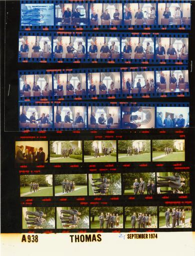 Keywords: Ford A0938 NLGRF photo contact sheet (1974-09-21)(Gerald Ford Library).jpg White House Photographic Office WHPO is housed at the Gerald R Ford Presidential Library a branch of the National Archives and Records Administration NARA <br/><br/> This file is a 200 dpi photo contact sheet having images from roll of film A0938 of the August 9 1974 - January 20 1977 Gerald R Ford White House Photographic Office Series A0001-A9999 and B0001-B2886 photographs <br/><br/> The date on the photo contact sheet is the date the roll of film was processed not necessarily the date the photographs were taken See table below for additional details 1974-09-21 Gerald R Ford Presidential Library Image http //www fordlibrarymuseum gov/library/whphotos/A0938_NLGRF jpg A0938_NLGRF jpg from http //www fordlibrarymuseum gov/library/whphotos/19740921whpo pdf White House Photographs September 21 1974 of the http //www fordlibrarymuseum gov/Library/whphotos/whpo asp White House Photographic Collection page White House Photographic Office WHPO - Thomas PD-USGov Institution Institution Gerald R Ford Presidential Library Table wikitable sortable + Photo contact sheet A0938 U S President Ford Administration Gerald R Ford Library Frame s Tone Subject proper Subject generic Names Geographic Location Photographer Date - 3 Color Soviet Foreign Minister; Ambassador of Union of Soviet Socialist Republics USSR to United States walking toward Cabinet Room Andrei Gromyko Ambassador Anatoly Dobrynin Ambassador Henry Catto Colonnade Thomas 1974-09-21 - 4 Color Soviet Foreign Minister; Ambassador of Union of Soviet Socialist Republics USSR to United States leaning on chair backs talking Andrei Gromyko Ambassador Anatoly Dobrynin Cabinet Room Thomas 1974-09-21 - 5 Color Soviet Foreign Minister; Ambassador of Union of Soviet Socialist Republics USSR to United States leaning on chair backs talking Andrei Gromyko Ambassador Anatoly Dobrynin Ambassador Henry Catto Cabinet Room Thomas 1974-09-21 - 6 Color Soviet Foreign Minister; Ambassador of Union of Soviet Socialist Republics USSR to United States talking; Kennerly handing camera to Gromyko Andrei Gromyko Ambassador Anatoly Dobrynin Kennerly Cabinet Room Thomas 1974-09-21 - 7 Color Soviet Foreign Minister Gromyko looking at camera Andrei Gromyko Kennerly Cabinet Room Thomas 1974-09-21 - 8 Color Soviet Foreign Minister; Ambassador of Union of Soviet Socialist Republics USSR to United States Gromyko looking through camera viewfinder Andrei Gromyko Ambassador Anatoly Dobrynin Kennerly Cabinet Room Thomas 1974-09-21 - 9-15 Color Soviet Foreign Minister; Ambassador of Union of Soviet Socialist Republics USSR to United States standing talking; leaning on backs of chairs Andrei Gromyko Ambassador Anatoly Dobrynin Kennerly Cabinet Room Thomas 1974-09-21 - 16 Color Soviet Foreign Minister; Ambassador of Union of Soviet Socialist Republics USSR to United States greeting handshaking; Kennerly taking photograph Scowcroft Andrei Gromyko Ambassador Anatoly Dobrynin Kennerly Cabinet Room Thomas 1974-09-21 - 17 Color Soviet Foreign Minister; Ambassador of Union of Soviet Socialist Republics USSR to United States greeting handshaking Scowcroft Andrei Gromyko Ambassador Anatoly Dobrynin Cabinet Room Thomas 1974-09-21 - 18 Color Soviet Foreign Minister; Ambassador of Union of Soviet Socialist Republics USSR to United States greeting handshaking; Kennerly taking photograph Kissinger Andrei Gromyko Ambassador Anatoly Dobrynin Kennerly Cabinet Room Thomas 1974-09-21 - 19-21 Color Soviet Foreign Minister; Ambassador of Union of Soviet Socialist Republics USSR to United States standing talking Kissinger Andrei Gromyko Ambassador Anatoly Dobrynin Cabinet Room Thomas 1974-09-21 - 22-23 Color Soviet Foreign Minister; Ambassador of Union of Soviet Socialist Republics USSR to United States standing talking near doorway GRF Kissinger Andrei Gromyko Ambassador Anatoly Dobrynin Oval Office Thomas 1974-09-21 - 24-31 Color Departure of Soviet Foreign Minister walking towards South Driveway -all not in each frame GRF Kissinger Andrei Gromyko Ambassador Anatoly Dobrynin Scowcroft Victor Sukhrodev Walkway between Oval Office and Driveway Thomas 1974-09-21 - 32-37 Color Departure of Soviet Foreign Minister standing talking handshaking - all not in each frame GRF Kissinger Andrei Gromyko Ambassador Anatoly Dobrynin Scowcroft Victor Sukhrodev Walkway between Oval Office and Driveway Thomas 1974-09-21 Gerald R Ford Presidential Library and Museum-cooperation PD-USGov Contact sheets by the Ford White House September 1974 |
