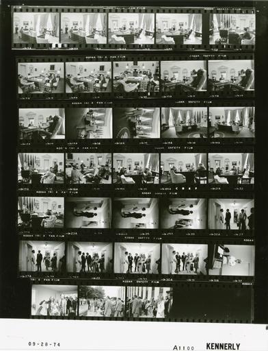 | Keywords: Ford A1100 NLGRF photo contact sheet (1974-09-28)(Gerald Ford Library).jpg White House Photographic Office WHPO is housed at the Gerald R Ford Presidential Library a branch of the National Archives and Records Administration NARA <br/><br/> This file is a 200 dpi photo contact sheet having images from roll of film A1100 of the August 9 1974 - January 20 1977 Gerald R Ford White House Photographic Office Series A0001-A9999 and B0001-B2886 photographs <br/><br/> The date on the photo contact sheet is the date the roll of film was processed not necessarily the date the photographs were taken See table below for additional details 1974-09-28 Gerald R Ford Presidential Library Image http //www fordlibrarymuseum gov/library/whphotos/A1100_NLGRF jpg A1100_NLGRF jpg from http //www fordlibrarymuseum gov/library/whphotos/19740928whpo pdf White House Photographs September 28 1974 of the http //www fordlibrarymuseum gov/Library/whphotos/whpo asp White House Photographic Collection page White House Photographic Office WHPO <br/> Creator David Hume Kennerly PD-USGov Institution Institution Gerald R Ford Presidential Library Table wikitable sortable + Photo contact sheet A1100 U S President Ford Administration Gerald R Ford Library Frame s Tone Subject proper Subject generic Names Geographic Location Photographer Date - 3-13 BW Chief of Staff seated around desk - taken from different angles GRF Rumsfeld Oval Office Kennerly 1974-09-28 - 14-16 BW GRF seated Hartmann standing leaning over; Buchen walking towards desk GRF Hartmann Buchen Oval Office Kennerly 1974-09-28 - 17 BW seated around desk GRF Hartmann Buchen Oval Office Kennerly 1974-09-28 - 18 BW seated around desk; Marsh standing GRF Hartmann Buchen Marsh Oval Office Kennerly 1974-09-28 - 19-23 BW seated around desk - taken from different angles GRF Hartmann Buchen Marsh Oval Office Kennerly 1974-09-28 - 24-25 BW Trip to Hospital to visit Betty Ford -Bethesda Maryland standing talking Lukash Navy Doctor Bethesda MD Bethesda Naval Hospital - Hallway Kennerly 1974-09-28 - 26-27 BW Trip to Hospital to visit Betty Ford -Bethesda Maryland standing talking; Unidentified Man walking down hallway Lukash Navy Doctor Unidentified Man Bethesda MD Bethesda Naval Hospital - Hallway Kennerly 1974-09-28 - 28-31 BW Trip to Hospital to visit Betty Ford -Bethesda Maryland standing talking handshaking Lukash Navy Doctor Susan Ford Gayle Ford Janet Ford Billy Zeoli Bethesda MD Bethesda Naval Hospital - Hallway Kennerly 1974-09-28 - 32 BW Betty Ford's Nurse - Bethesda Maryland seated smiling arms folded Nurse Jo Ann O'Brien Bethesda MD Bethesda Naval Hospital - Nurse's Station Kennerly 1974-09-28 - 33 BW Trip to Hospital to visit Betty Ford -Bethesda Maryland walking out of hospital GRF Susan Ford Gayle Ford Janet Ford Billy Zeoli Unidentified Man Bethesda MD Bethesda Naval Hospital - Hallway Kennerly 1974-09-28 - 34-35 BW Report on vsit with Betty Ford - Bethesda Maryland GRF at microphones making statement GRF Susan Ford Mike Ford Gayle Ford Janet Ford Billy Zeoli Media Secret Service Bethesda MD Steps outside Bethesda Naval Hospital Kennerly 1974-09-28 Gerald R Ford Presidential Library and Museum-cooperation PD-USGov Contact sheets by the Ford White House September 1974 Photographs by David Hume Kennerly from 1974 |