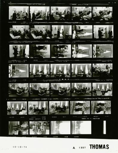| Keywords: Ford A1357 NLGRF photo contact sheet (1974-10-10)(Gerald Ford Library).jpg White House Photographic Office WHPO is housed at the Gerald R Ford Presidential Library a branch of the National Archives and Records Administration NARA <br/><br/> This file is a 200 dpi photo contact sheet having images from roll of film A1357 of the August 9 1974 - January 20 1977 Gerald R Ford White House Photographic Office Series A0001-A9999 and B0001-B2886 photographs <br/><br/> The date on the photo contact sheet is the date the roll of film was processed not necessarily the date the photographs were taken See table below for additional details 1974-10-10 Gerald R Ford Presidential Library Image http //www fordlibrarymuseum gov/library/whphotos/A1357_NLGRF jpg A1357_NLGRF jpg from http //www fordlibrarymuseum gov/library/whphotos/19741010whpo pdf White House Photographs October 10 1974 of the http //www fordlibrarymuseum gov/Library/whphotos/whpo asp White House Photographic Collection page White House Photographic Office WHPO - Thomas PD-USGov Institution Institution Gerald R Ford Presidential Library Table wikitable sortable + Photo contact sheet A1357 U S President Ford Administration Gerald R Ford Library Frame s Tone Subject proper Subject generic Names Geographic Location Photographer Date - 4-5 BW Meeting to Discuss Midwest Farms Problems Greeting handshaking - all not in every frame GRF Reps Thompson Mayne Thone Andrews Taylor Scherle Oval Office Thomas 1974-10-10 - 6-10 BW Meeting to Discuss Midwest Farms Problems seated near fireplace -all not in every frame GRF Reps Thompson Mayne Thone Andrews Taylor Scherle Seidman Friedersdorf Oval Office Thomas 1974-10-10 - 11-12 BW United States Representative from Texas TX greeting handshaking GRF Rep Price Oval Office Thomas 1974-10-10 - 13-16 BW United States Representative from Texas TX ; Candidate for Texas Commissioner of Agriculture greeting handshaking standing talking GRF Rep Price Zach Fisher Oval Office Thomas 1974-10-10 - 17-22 BW standing near desk reading document - various distances GRF Oval Office Thomas 1974-10-10 - 23 BW seated around desk GRF Sec Simon Seidman Scowcroft Oval Office Thomas 1974-10-10 - 24-31 BW seated around desk - taken from various directions and distances GRF Ash Cole Areeda Timmons Scowcroft Others Oval Office Thomas 1974-10-10 - 32-33 BW Prior to helicopter flight to Andrews Air Force Base standing waiting for GRF Cheney Rumsfeld Seidman Burch Hartmann South Lawn Thomas 1974-10-10 - 34-35 BW Prior to helicopter flight to Andrews Air Force Base walking talking - moving from Oval Office towards camera GRF Burch South Lawn Thomas 1974-10-10 - 36-37 BW Helicopter flight to Andrews Air Force Base flying away from camera - fountain and Washington Monument in picture Marine One South Lawn Thomas 1974-10-10 Gerald R Ford Presidential Library and Museum-cooperation PD-USGov Contact sheets by the Ford White House October 1974 |