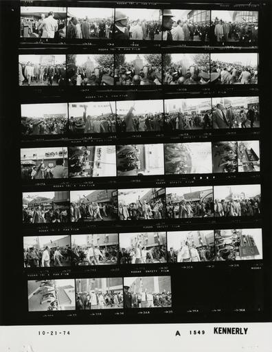 Keywords: Ford A1549 NLGRF photo contact sheet (1974-10-21)(Gerald Ford Library).jpg White House Photographic Office WHPO is housed at the Gerald R Ford Presidential Library a branch of the National Archives and Records Administration NARA <br/><br/> This file is a 200 dpi photo contact sheet having images from roll of film A1549 of the August 9 1974 - January 20 1977 Gerald R Ford White House Photographic Office Series A0001-A9999 and B0001-B2886 photographs <br/><br/> The date on the photo contact sheet is the date the roll of film was processed not necessarily the date the photographs were taken See table below for additional details 1974-10-21 Gerald R Ford Presidential Library Image http //www fordlibrarymuseum gov/library/whphotos/A1549_NLGRF jpg A1549_NLGRF jpg from http //www fordlibrarymuseum gov/library/whphotos/19741021whpo pdf White House Photographs October 21 1974 of the http //www fordlibrarymuseum gov/Library/whphotos/whpo asp White House Photographic Collection page White House Photographic Office WHPO <br/> Creator David Hume Kennerly PD-USGov Institution Institution Gerald R Ford Presidential Library Table wikitable sortable + Photo contact sheet A1549 U S President Ford Administration Gerald R Ford Library Frame s Tone Subject proper Subject generic Names Geographic Location Photographer Date - 2A-4A BW Trip to Mexico; President of Mexico -Nogales Arizona/Nogales Mexico walking; greeting handshaking - all not in every frame GRF Luis Echeverria Secret Service Crowd Nogales AZ / Nogales Mexico United States - Mexico Border Kennerly 1974-10-21 - 5A-7A BW Trip to Mexico; President of Mexico -Nogales Arizona/Nogales Mexico walking; greeting handshaking; glass building in background - all not in every frame GRF Luis Echeverria Secret Service Crowd Nogales AZ / Nogales Mexico United States - Mexico Border Kennerly 1974-10-21 - 8A-10A BW Trip to Mexico; President of Mexico -Nogales Arizona/Nogales Mexico standing near Benito Juarez Monument GRF Luis Echeverria Others Nogales AZ / Nogales Mexico United States - Mexico Border Kennerly 1974-10-21 - 11A-34A BW Trip to Mexico; President of Mexico -Nogales Arizona/Nogales Mexico walking through both cities waving to crowd - all not in every frame GRF Luis Echeverria Others Nogales AZ / Nogales Mexico United States - Mexico Border Kennerly 1974-10-21 Gerald R Ford Presidential Library and Museum-cooperation PD-USGov Contact sheets by the Ford White House October 1974 Photographs by David Hume Kennerly from 1974 |