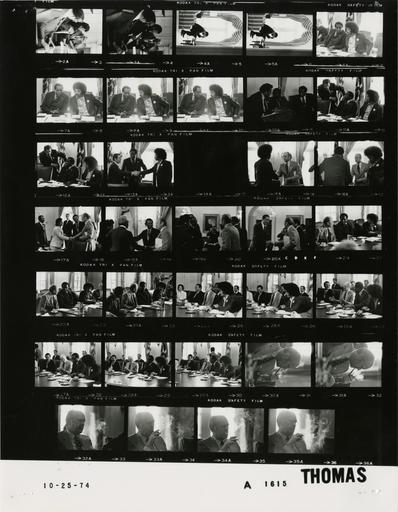Keywords: Ford A1615 NLGRF photo contact sheet (1974-10-25)(Gerald Ford Library).jpg White House Photographic Office WHPO is housed at the Gerald R Ford Presidential Library a branch of the National Archives and Records Administration NARA <br/><br/> This file is a 200 dpi photo contact sheet having images from roll of film A1615 of the August 9 1974 - January 20 1977 Gerald R Ford White House Photographic Office Series A0001-A9999 and B0001-B2886 photographs <br/><br/> The date on the photo contact sheet is the date the roll of film was processed not necessarily the date the photographs were taken See table below for additional details 1974-10-25 Gerald R Ford Presidential Library Image http //www fordlibrarymuseum gov/library/whphotos/A1615_NLGRF jpg A1615_NLGRF jpg from http //www fordlibrarymuseum gov/library/whphotos/19741025whpo pdf White House Photographs October 25 1974 of the http //www fordlibrarymuseum gov/Library/whphotos/whpo asp White House Photographic Collection page White House Photographic Office WHPO - Thomas PD-USGov Institution Institution Gerald R Ford Presidential Library Table wikitable sortable + Photo contact sheet A1615 U S President Ford Administration Gerald R Ford Library Frame s Tone Subject proper Subject generic Names Geographic Location Photographer Date - 2A-3A BW Prior to Meeting with Civil Rights Leaders seated talking at table Clarence Mitchell Dorothy Height Pauline Ellison Carlton Goodlett Bayard Rustin Cabinet Room Thomas 1974-10-25 - 4A-5A BW Prior to Meeting with Civil Rights Leaders - Special Assistant for Minority Affairs seated on couch reading hand on glasses Stanley Scott Scheduling and Advance Office Thomas 1974-10-25 - 6A-9A BW Prior to Meeting with Civil Rights Leaders - Executive Director Urban League; National President Operation PUSH seated talking at table Vernon Jordan Rev Jesse Jackson Cabinet Room Thomas 1974-10-25 - 10A BW Prior to Meeting with Civil Rights Leaders - Deputy Special Assistant for Minority Affairs; President Southern Christian Leadership Conference seated talking Calhoun Unidentified Ralph Abernathy Cabinet Room Thomas 1974-10-25 - 11A-12A BW Prior to Meeting with Civil Rights Leaders - Deputy Special Assistant for Minority Affairs; Executive Director Urban League; National President Operation PUSH Calhoun leaning on chair others seated at table Calhoun Vernon Jordan Rev Jesse Jackson Cabinet Room Thomas 1974-10-25 - 13A BW Prior to Meeting with Civil Rights Leaders - Executive Director Urban League; National President Operation PUSH standing; Rumsfeld and Rev Jesse Jackson handshaking Rumsfeld Vernon Jordan Rev Jesse Jackson Cabinet Room Thomas 1974-10-25 - 14A BW Prior to Meeting with Civil Rights Leaders - Executive Director Urban League; National President Operation PUSH standing; Rumsfeld and Rev Jesse Jackson handshaking Rev Jesse Jackson Thomas 1974-10-25 - 15A BW Prior to Meeting with Civil Rights Leaders - National President Operation PUSH handshaking GRF Rev Jesse Jackson Cabinet Room Thomas 1974-10-25 - 16A BW Prior to Meeting with Civil Rights Leaders - Executive Director Urban League; National President Operation PUSH standing talking; Jordan back to camera GRF Vernon Jordan Rev Jesse Jackson Cabinet Room Thomas 1974-10-25 - 17A-19A BW Prior to Meeting with Civil Rights Leaders greeting handshaking GRF Scott Participants Cabinet Room Thomas 1974-10-25 - 20A BW Prior to Meeting with Civil Rights Leaders - Chairman Opportunities Industrial Centers of America Inc greeting handshaking GRF Rev Leon Sullivan Cabinet Room Thomas 1974-10-25 - 21A-22A BW Meeting with Civil Rights Leaders -Executive Director Urban League; National President Operation PUSH seated at table talking GRF Vernon Jordan Rev Jesse Jackson Cabinet Room Thomas 1974-10-25 - 23A BW Meeting with Civil Rights Leaders - Executive Director Urban League; National President Operation PUSH seated at table talking Scott GRF Vernon Jordan Rev Jesse Jackson Cabinet Room Thomas 1974-10-25 - 24A-25A BW Meeting with Civil Rights Leaders - President National Council of Negro Women seated at table talking Dorothy Height Scott GRF Vernon Jordan Rev Jesse Jackson Cabinet Room Thomas 1974-10-25 - 26A-29A BW Meeting with Civil Rights Leaders - Executive Director Urban League; National President Operation PUSH seated at table talking Scott GRF Vernon Jordan Rev Jesse Jackson Cabinet Room Thomas 1974-10-25 - 30A-35A BW Meeting with Civil Rights Leaders smoking pipe; wafts of smoke around head -backlit head and shoulder portrait s GRF Cabinet Room Thomas 1974-10-25 Gerald R Ford Presidential Library and Museum-cooperation PD-USGov Contact sheets by the Ford White House October 1974 Civil rights activists from the United States ¢ Ralph David Abernathy ¢ Jesse Jackson ¢ Vernon Jordan ¢