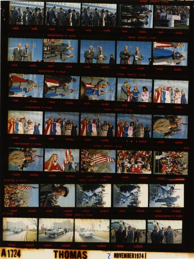 | Keywords: Ford A1724 NLGRF photo contact sheet (1974-11-02)(Gerald Ford Library).jpg White House Photographic Office WHPO is housed at the Gerald R Ford Presidential Library a branch of the National Archives and Records Administration NARA <br/><br/> This file is a 200 dpi photo contact sheet having images from roll of film A1724 of the August 9 1974 - January 20 1977 Gerald R Ford White House Photographic Office Series A0001-A9999 and B0001-B2886 photographs <br/><br/> The date on the photo contact sheet is the date the roll of film was processed not necessarily the date the photographs were taken See table below for additional details 1974-11-02 Gerald R Ford Presidential Library Image http //www fordlibrarymuseum gov/library/whphotos/A1724_NLGRF jpg A1724_NLGRF jpg from http //www fordlibrarymuseum gov/library/whphotos/19741102whpo pdf White House Photographs November 2 1974 of the http //www fordlibrarymuseum gov/Library/whphotos/whpo asp White House Photographic Collection page White House Photographic Office WHPO - Thomas PD-USGov Institution Institution Gerald R Ford Presidential Library Table wikitable sortable + Photo contact sheet A1724 U S President Ford Administration Gerald R Ford Library Frame s Tone Subject proper Subject generic Names Geographic Location Photographer Date - 3-6 Color Arrival in Colorado - Grand Junction Colorado greeting handshaking; all not in every frame GRF Unidentified Family Grand Junction CO Walker Field Thomas 1974-11-02 - 7 Color Prior to Campaign Rally for Sen Dominick - Grand Junction Colorado seated behind large Welcome President Ford sign Mesa County Republican Women Grand Junction CO Lincoln Park Baseball Field - Outside Thomas 1974-11-02 - 8-11 Color Campaign Rally for Sen Dominick; United States Senator for Colorado - Grand Junction Colorado standing on platform; various distances GRF Sen Dominick Grand Junction CO Lincoln Park Baseball Field Thomas 1974-11-02 - 12-21 Color Campaign Rally for Sen Dominick; Mesa Junior College Queen and Court - Grand Junction Colorado greeting handshaking hugging posing; all not in every frame GRF Diane Pastor Court Grand Junction CO Lincoln Park Baseball Field Thomas 1974-11-02 - 22-23 Color Campaign Rally for Sen Dominick; United States Senator from Colorado - Grand Junction Colorado seated on platform; agent standing in foreground GRF Sen Dominick Secret Service Grand Junction CO Lincoln Park Baseball Field Thomas 1974-11-02 - 24 Color Campaign Rally for Sen Dominick; Mesa Junior College Queen - Grand Junction Colorado seated on platform talking; close up GRF Diane Pastor Grand Junction CO Lincoln Park Baseball Field Thomas 1974-11-02 - 25-28 Color Campaign Rally for Sen Dominick - Grand Junction Colorado seated in grandstands; large flag and several signs in some photos Crowd Grand Junction CO Lincoln Park Baseball Field Thomas 1974-11-02 - 29 Color Campaign Rally for Sen Dominick; Cap Gift from Joe Davis Chairman of the Dominick Campaign Rally -Grand Junction Colorado wearing McCoy Caterpillar Cap GRF Grand Junction CO Lincoln Park Baseball Field Thomas 1974-11-02 - 30-32 Color Visit to Grand Junction Veterans Administration Hospital -Grand Junction Colorado greeting handshaking GRF Nurses Patient in Wheelchair Grand Junction CO Veterans Administration Hospital - Outside Thomas 1974-11-02 - 33-34 Color Departure From Grand Junction Veterans Administration Hospital -Grand Junction Colorado GRF standing waving through open roof GRF Secret Service Secret Service Grand Junction CO Driveway Near Veterans Administration Hospital Thomas 1974-11-02 - 35 Color Departure From Grand Junction Veterans Administration Hospital -Grand Junction Colorado Press limousine Media Secret Service Grand Junction CO Driveway Near Veterans Administration Hospital Thomas 1974-11-02 - 36-37 Color Prior to Departure for Wichita Kansas - Grand Junction Colorado handshaking saying goodbye; Air Force One in background GRF Others Grand Junction CO Walker Field Thomas 1974-11-02 Gerald R Ford Presidential Library and Museum-cooperation PD-USGov Contact sheets by the Ford White House November 1974 |