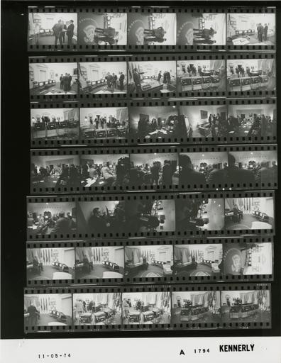 | Keywords: Ford A1794 NLGRF photo contact sheet (1974-11-05)(Gerald Ford Library).jpg White House Photographic Office WHPO is housed at the Gerald R Ford Presidential Library a branch of the National Archives and Records Administration NARA <br/><br/> This file is a 200 dpi photo contact sheet having images from roll of film A1794 of the August 9 1974 - January 20 1977 Gerald R Ford White House Photographic Office Series A0001-A9999 and B0001-B2886 photographs <br/><br/> The date on the photo contact sheet is the date the roll of film was processed not necessarily the date the photographs were taken See table below for additional details 1974-11-05 Gerald R Ford Presidential Library Image http //www fordlibrarymuseum gov/library/whphotos/A1794_NLGRF jpg A1794_NLGRF jpg from http //www fordlibrarymuseum gov/library/whphotos/19741105whpo pdf White House Photographs November 5 1974 of the http //www fordlibrarymuseum gov/Library/whphotos/whpo asp White House Photographic Collection page White House Photographic Office WHPO <br/> Creator David Hume Kennerly PD-USGov Institution Institution Gerald R Ford Presidential Library Table wikitable sortable + Photo contact sheet A1794 U S President Ford Administration Gerald R Ford Library Frame s Tone Subject proper Subject generic Names Geographic Location Photographer Date - 2A-8A BW Watching Election Returns -Manager for Public and Customer Relations and Aerospace Group Executive for Thiokol Corporation standing in center of room talking looking at televisions - GRF's back to camera GRF Rumsfeld James Brown Oval Office Kennerly 1974-11-05 - 9A BW Watching Election Returns -Manager for Public and Customer Relations and Aerospace Group Executive for Thiokol Corporation; Consultant Counsellor to the President GRF standing near desk Stiles and Rumsfeld handshaking GRF Rumsfeld James Brown Jack Stiles Oval Office Kennerly 1974-11-05 - 10A-12A BW Watching Election Returns -Manager for Public and Customer Relations and Aerospace Group Executive for Thiokol Corporation; Consultant Counsellor to the President GRF seated at desk smoking pipe; others looking at televisions - taken from behind televisions GRF Rumsfeld James Brown Jack Stiles Hartmann Oval Office Kennerly 1974-11-05 - 13A BW Watching Election Returns -Manager for Public and Customer Relations and Aerospace Group Executive for Thiokol Corporation; Consultant Counsellor to the President GRF walking smoking pipe; others looking at televisions - taken from behind televisions GRF Rumsfeld James Brown Jack Stiles Hartmann Oval Office Kennerly 1974-11-05 - 14A-22A BW Watching Election Returns standing talking handshaking watching television - all not in every frame Carlson Nessen Hartmann Betty Ford GRF Rumsfeld Timmons Marsh Cheney Ash Others Roosevelt Room Kennerly 1974-11-05 - 23A BW seated near small table smoking pipe Rumsfeld Roosevelt Room Kennerly 1974-11-05 - 24A-25A BW Watching Election Returns seated around table; moving around room - all not in every frame Carlson Nessen Hartmann Betty Ford GRF Rumsfeld Timmons Marsh Cheney Ash Others Roosevelt Room Kennerly 1974-11-05 - 26A-32A BW Watching Election Returns seated on edge of desk watching televisions; Jack Stiles only in frame 32A obscuring GRF GRF Jack Stiles Oval Office Kennerly 1974-11-05 - 33A-34A BW Watching Election Returns -Consultant Counsellor to the President standing talking watching televisions - taken from behind televisions GRF Betty Ford Jack Stiles Hartmann Oval Office Kennerly 1974-11-05 - 35A-36A BW Watching Election Returns seated on edge of desk watching televisions GRF Betty Ford Oval Office Kennerly 1974-11-05 Gerald R Ford Presidential Library and Museum-cooperation PD-USGov Contact sheets by the Ford White House November 1974 Photographs by David Hume Kennerly from 1974 |