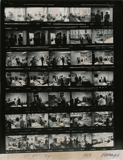Keywords: Ford A1810 NLGRF photo contact sheet (1974-11-06)(Gerald Ford Library).jpg White House Photographic Office WHPO is housed at the Gerald R Ford Presidential Library a branch of the National Archives and Records Administration NARA <br/><br/> This file is a 200 dpi photo contact sheet having images from roll of film A1810 of the August 9 1974 - January 20 1977 Gerald R Ford White House Photographic Office Series A0001-A9999 and B0001-B2886 photographs <br/><br/> The date on the photo contact sheet is the date the roll of film was processed not necessarily the date the photographs were taken See table below for additional details 1974-11-06 Gerald R Ford Presidential Library Image http //www fordlibrarymuseum gov/library/whphotos/A1810_NLGRF jpg A1810_NLGRF jpg from http //www fordlibrarymuseum gov/library/whphotos/19741106whpo pdf White House Photographs November 6 1974 of the http //www fordlibrarymuseum gov/Library/whphotos/whpo asp White House Photographic Collection page White House Photographic Office WHPO <br/> Creator David Hume Kennerly PD-USGov Institution Institution Gerald R Ford Presidential Library Table wikitable sortable + Photo contact sheet A1810 U S President Ford Administration Gerald R Ford Library Frame s Tone Subject proper Subject generic Names Geographic Location Photographer Date - 12-14 BW Presidential Tour of Old Executive Office Building greeting talking - all not in every frame GRF O'Donnell Mary Burns Beulah Baker Sarah Young Dorothy Spicer Helen White Ruth Krell Mary Lindsay Old Executive Office Building OEOB -Telephone Room Kennerly 1974-11-06 - 15-18 BW Presidential Tour of Old Executive Office Building greeting talking - all not in every frame GRF Dan Marks John Heiting Thomas Jones Linder; Rumsfeld Old Executive Office Building OEOB -Records Office Kennerly 1974-11-06 - 19 BW Presidential Tour of Old Executive Office Building greeting handshaking GRF Pierpont Mobley Lou Ann Francis Old Executive Office Building OEOB -Personnel Office Kennerly 1974-11-06 - 20-22 BW Presidential Tour of Old Executive Office Building greeting talking - all not in every frame GRF Thomas English Helen Hughes Margaret Peay Mathilda Morton Douglas Scott Old Executive Office Building OEOB -Administrative Office Kennerly 1974-11-06 - 23-25 BW Presidential Tour of Old Executive Office Building greeting talking - all not in every frame GRF James Smoot Thomas Dobin David Robinson Old Executive Office Building OEOB -Messenger Room Kennerly 1974-11-06 - 26-32 BW Presidential Tour of Old Executive Office Building greeting talking - all not in every frame GRF Flora Carroll Samuel Brungo Alvester Wilbanks Burtion Quigley Ruth Fantasia Mary Simon Virginia Hurt James Butler Bonnie Baxter James Buckler Delbert Fogelson Joan Lakes Charles Jones James Reagan Nile Kilgore Linder Old Executive Office Building OEOB -Mail Room Kennerly 1974-11-06 - 33-36 BW Presidential Tour of Old Executive Office Building greeting talking - all not in every frame GRF Linder William Matthews Norbert Strube Gordon Hobbs Everline Fisher Dolores Gorham Charles Love Barbara Brown Shirley Staalteri Diana Ritchie Clarence Henley Doris Austin Everett Houser Marietta O'Neill Old Executive Office Building OEOB -Central Files Kennerly 1974-11-06 - 2A BW Presidential Tour of Old Executive Office Building greeting talking GRF George Hannie Leonard Wood Charles Nash Lacy Brown Michael Sharp Clint Graham Clifton Brown Cecil Finney George Love Theodoric James; Rumsfeld Old Executive Office Building OEOB -Central Files Kennerly 1974-11-06 - 2-5 BW Special Agent in Charge Technical Services Division U S Secret Service seated around desk talking - various angles all not in every frame GRF Scowcroft Rumsfeld Cheney Robert Snow Oval Office Kennerly 1974-11-06 - 6-9 BW standing talking - Rumsfeld partially obscured on two frames GRF Rumsfeld Burch Scheduling and Advance Office Kennerly 1974-11-06 - 10 BW Prior to Presidential Tour of Old Executive Office Building walking toward OEOB -West Wing in background GRF O'Donnell Linder Secret Service Sidewalk Between Old Executive Office Building OEOB and White House Kennerly 1974-11-06 - 11 BW Prior to Presidential Tour of Old Executive Office Building walking toward OEOB -OEOB in background GRF O'Donnell Linder Secret Service Sidewalk Between Old Executive Office Building OEOB and White House Kennerly 1974-11-06 Gerald R Ford Presidential Library and Museum-cooperation PD-USGov Contact sheets by the Ford White House November 1974 Photographs by David Hume Kennerly from 1974