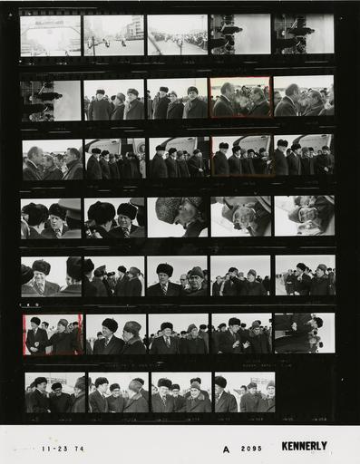 Keywords: Ford A2095 NLGRF photo contact sheet (1974-11-23)(Gerald Ford Library).jpg White House Photographic Office WHPO is housed at the Gerald R Ford Presidential Library a branch of the National Archives and Records Administration NARA <br/><br/> This file is a 200 dpi photo contact sheet having images from roll of film A2095 of the August 9 1974 - January 20 1977 Gerald R Ford White House Photographic Office Series A0001-A9999 and B0001-B2886 photographs <br/><br/> The date on the photo contact sheet is the date the roll of film was processed not necessarily the date the photographs were taken See table below for additional details 1974-11-23 Gerald R Ford Presidential Library Image http //www fordlibrarymuseum gov/library/whphotos/A2095_NLGRF jpg A2095_NLGRF jpg from http //www fordlibrarymuseum gov/library/whphotos/19741123whpo pdf White House Photographs November 23 1974 of the http //www fordlibrarymuseum gov/Library/whphotos/whpo asp White House Photographic Collection page White House Photographic Office WHPO <br/> Creator David Hume Kennerly PD-USGov Institution Institution Gerald R Ford Presidential Library Table wikitable sortable + Photo contact sheet A2095 U S President Ford Administration Gerald R Ford Library Frame s Tone Subject proper Subject generic Names Geographic Location Photographer Date - 18-20 BW Trip to the Union of Soviet Socialist Republics -Arrival Ceremony - Local Time head and shoulder portrait s -wearing Russian wool cap Brezhnev Vladivostok U S S R Vozdvizhenka Airport Kennerly 1974-11-23 - 21-22 BW Trip to the Union of Soviet Socialist Republics -Arrival Ceremony - Local Time standing talking smiling - GRF wearing Russian wool cap - all not in every frame GRF Others Vladivostok U S S R Vozdvizhenka Airport Kennerly 1974-11-23 - 1-3 BW Trip to Republic of Korea -Motorcade to Airport for Departure Ceremony - Local Time Crowd standing along curb; Police on motorcycles Crowd Police Escort Seoul South Korea Street Scene Kennerly 1974-11-23 - 4-6 BW Trip to Republic of Korea -Departure Ceremony - President of ROK - Local Time standing on platform for anthems GRF Park Chung Hee Seoul South Korea Kimpo International Airport Kennerly 1974-11-23 - 7-8 BW Trip to the Union of Soviet Socialist Republics -Prior to Arrival Ceremony - General Secretary - Local Time standing talking awaiting arrival of GRF Brezhnev Gromyko Amb Dobrynin Vladivostok U S S R Vozdvizhenka Airport Kennerly 1974-11-23 - 9-10 BW Trip to the Union of Soviet Socialist Republics -Arrival Ceremony -General Secretary - Local Time greeting embracing GRF Brezhnev Vladivostok U S S R Vozdvizhenka Airport Kennerly 1974-11-23 - 11 BW Trip to the Union of Soviet Socialist Republics -Arrival Ceremony -General Secretary; Foreign Minister - Local Time GRF greeting Gromyko; Brezhnev in background GRF Brezhnev Gromyko Vladivostok U S S R Vozdvizhenka Airport Kennerly 1974-11-23 - 12-15 BW Trip to the Union of Soviet Socialist Republics -Arrival Ceremony - Local Time standing posing near Air Force One - all wearing Russian wool caps GRF Kissinger Brezhnev Gromyko Amb Dobrynin Vladivostok U S S R Vozdvizhenka Airport Kennerly 1974-11-23 - 16-17 BW Trip to the Union of Soviet Socialist Republics -Arrival Ceremony - Local Time standing talking; Brezhnev's back to camera - both wearing Russian wool caps GRF Brezhnev Vladivostok U S S R Vozdvizhenka Airport Kennerly 1974-11-23 - 23-30 BW Trip to the Union of Soviet Socialist Republics -Arrival Ceremony - Local Time standing talking smiling - wearing Russian wool caps GRF Brezhnev Vladivostok U S S R Vozdvizhenka Airport Kennerly 1974-11-23 - 31-33 BW Trip to the Union of Soviet Socialist Republics -Arrival Ceremony - Local Time standing talking smiling - wearing Russian wool caps GRF Brezhnev Kissinger Vladivostok U S S R Vozdvizhenka Airport Kennerly 1974-11-23 - 34 BW Trip to the Union of Soviet Socialist Republics -Arrival Ceremony - Local Time walking apart - wearing Russian wool caps GRF Gromyko Brezhnev Vladivostok U S S R Vozdvizhenka Airport Kennerly 1974-11-23 Gerald R Ford Presidential Library and Museum-cooperation PD-USGov Contact sheets by the Ford White House November 1974 Photographs by David Hume Kennerly from 1974 |