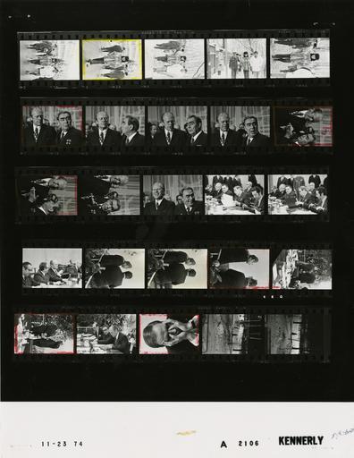 Keywords: Ford A2106 NLGRF photo contact sheet (1974-11-23)(Gerald Ford Library).jpg White House Photographic Office WHPO is housed at the Gerald R Ford Presidential Library a branch of the National Archives and Records Administration NARA <br/><br/> This file is a 200 dpi photo contact sheet having images from roll of film A2106 of the August 9 1974 - January 20 1977 Gerald R Ford White House Photographic Office Series A0001-A9999 and B0001-B2886 photographs <br/><br/> The date on the photo contact sheet is the date the roll of film was processed not necessarily the date the photographs were taken See table below for additional details 1974-11-23 Gerald R Ford Presidential Library Image http //www fordlibrarymuseum gov/library/whphotos/A2106_NLGRF jpg A2106_NLGRF jpg from http //www fordlibrarymuseum gov/library/whphotos/19741123whpo pdf White House Photographs November 23 1974 of the http //www fordlibrarymuseum gov/Library/whphotos/whpo asp White House Photographic Collection page White House Photographic Office WHPO <br/> Creator David Hume Kennerly PD-USGov Institution Institution Gerald R Ford Presidential Library Table wikitable sortable + Photo contact sheet A2106 U S President Ford Administration Gerald R Ford Library Frame s Tone Subject proper Subject generic Names Geographic Location Photographer Date - 2A-6A BW Trip to the Union of Soviet Socialist Republics -Prior to Meeting with General Secretary Leonid Brezhnev - Local Time walking towards Conference Hall; moving towards camera - GRF wearing wolfskin coat and Russian wool cap GRF Barrett Secret Service Others Vladivostok U S S R Okeansky Sanitarium -Outside Kennerly 1974-11-23 - 7A-14A BW Trip to the Union of Soviet Socialist Republics -Prior to Meeting with General Secretary - Local Time standing talking laughing smiling; Brezhnev gesturing holding cigarette in some frames GRF Brezhnev Vladivostok U S S R Okeansky Sanitarium -Conference Hall Kennerly 1974-11-23 - 15A-16A BW Trip to the Union of Soviet Socialist Republics -Meeting to Discuss Nuclear Arms Limitations and Signing Joint Communique - Local Time seated at table across from American delegation not shown Brezhnev Andrei Gromyko Amb Dobrynin Victor Sukhrodev Others Vladivostok U S S R Okeansky Sanitarium -Conference Hall Kennerly 1974-11-23 - 17A BW Trip to the Union of Soviet Socialist Republics -Meeting to Discuss Nuclear Arms Limitations and Signing Joint Communique - Local Time seated at table across from Soviet delegation not shown GRF Sonnenfeldt Kissinger Amb Stoessel Vladivostok U S S R Okeansky Sanitarium -Conference Hall Kennerly 1974-11-23 - 18A-22A BW Trip to the Union of Soviet Socialist Republics -Break During Meeting to Discuss Nuclear Arms Limitations and Signing Joint Communique - Local Time standing talking; backs to camera in several frames - various distances GRF Kissinger Vladivostok U S S R Okeansky Sanitarium -Conference Hall Kennerly 1974-11-23 - 23A BW Trip to the Union of Soviet Socialist Republics -Meeting to Discuss Nuclear Arms Limitations and Signing Joint Communique - Local Time seated at table across from Soviet delegation not shown GRF Kissinger Vladivostok U S S R Okeansky Sanitarium -Conference Hall Kennerly 1974-11-23 - 24A BW Trip to the Union of Soviet Socialist Republics Local Time head in hands eyes closed - head and shoulder portrait s Cheney Vladivostok U S S R Okeansky Sanitarium Kennerly 1974-11-23 - 25A-26A BW Trip to the Union of Soviet Socialist Republics Local Time walking across snow; silhouette Unidentified Man Vladivostok U S S R Okeansky Sanitarium -Outside Kennerly 1974-11-23 Gerald R Ford Presidential Library and Museum-cooperation PD-USGov Contact sheets by the Ford White House November 1974 Photographs by David Hume Kennerly from 1974 |