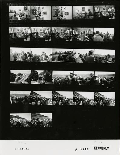 | Keywords: Ford A2226 NLGRF photo contact sheet (1974-11-30)(Gerald Ford Library).jpg White House Photographic Office WHPO is housed at the Gerald R Ford Presidential Library a branch of the National Archives and Records Administration NARA <br/><br/> This file is a 200 dpi photo contact sheet having images from roll of film A2226 of the August 9 1974 - January 20 1977 Gerald R Ford White House Photographic Office Series A0001-A9999 and B0001-B2886 photographs <br/><br/> The date on the photo contact sheet is the date the roll of film was processed not necessarily the date the photographs were taken See table below for additional details 1974-11-30 Gerald R Ford Presidential Library Image http //www fordlibrarymuseum gov/library/whphotos/A2226_NLGRF jpg A2226_NLGRF jpg from http //www fordlibrarymuseum gov/library/whphotos/19741130whpo pdf White House Photographs November 30 1974 of the http //www fordlibrarymuseum gov/Library/whphotos/whpo asp White House Photographic Collection page White House Photographic Office WHPO <br/> Creator David Hume Kennerly PD-USGov Institution Institution Gerald R Ford Presidential Library Table wikitable sortable + Photo contact sheet A2226 U S President Ford Administration Gerald R Ford Library Frame s Tone Subject proper Subject generic Names Geographic Location Photographer Date - 1A-4A BW U S Senator from Louisiana LA seated near fireplace -all not in every frame GRF Sen Long Korologos Media Oval Office Kennerly 1974-11-30 - 5A-9A BW Meeting to Discuss General Revenue Sharing seated around table; all may not be in every frame GRF Simon O'Neill Greenspan Schmults Watt Seidman Marsh Hartmann Timmons Cole Falk Scott Cabinet Room Kennerly 1974-11-30 - 10A-12A BW Arrival for 75th Army-Navy Football Game -Philadelphia Pennsylvania greeting handshaking GRF Crowd Philadelphia PA United States Naval Base Helipad Kennerly 1974-11-30 - 13A BW Arrival for 75th Army-Navy Football Game Philadelphia Pennsylvania seated in open automobile; wearing uniform Lukash Philadelphia PA United States Naval Base Helipad Kennerly 1974-11-30 - 14A-17A BW Arrival for 75th Army-Navy Football Game Captains Navy Football Team; Captain Army Football Team - Philadelphia Pennsylvania standing for coin toss presentation of commemorative medallion GRF Cliff Collier Tim Harden Robert Johnson Game Officials Philadelphia PA John F Kennedy Stadium Kennerly 1974-11-30 - 18A-21A BW Arrival for 75th Army-Navy Football Game Philadelphia Pennsylvania greeting handshaking; GRF walking to seat on Navy side of field GRF Crowd Philadelphia PA John F Kennedy Stadium Kennerly 1974-11-30 - 22A-27A BW 75th Army-Navy Football Game - Naval Academy Superintendent; Secretary of the Navy - Philadelphia Pennsylvania seated on Navy side of field watching game - all not in every frame GRF Vice Adm William Mack J William Middendorf Others Philadelphia PA John F Kennedy Stadium Kennerly 1974-11-30 Gerald R Ford Presidential Library and Museum-cooperation PD-USGov Contact sheets by the Ford White House November 1974 Photographs by David Hume Kennerly from 1974 |