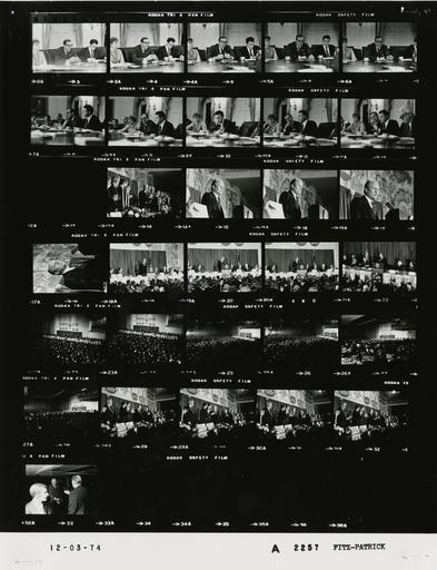 Keywords: Ford A2257 NLGRF photo contact sheet (1974-12-03)(Gerald Ford Library).jpg White House Photographic Office WHPO is housed at the Gerald R Ford Presidential Library a branch of the National Archives and Records Administration NARA <br/><br/> This file is a 200 dpi photo contact sheet having images from roll of film A2257 of the August 9 1974 - January 20 1977 Gerald R Ford White House Photographic Office Series A0001-A9999 and B0001-B2886 photographs <br/><br/> The date on the photo contact sheet is the date the roll of film was processed not necessarily the date the photographs were taken See table below for additional details 1974-12-03 Gerald R Ford Presidential Library Image http //www fordlibrarymuseum gov/library/whphotos/A2257_NLGRF jpg A2257_NLGRF jpg from http //www fordlibrarymuseum gov/library/whphotos/19741203whpo pdf White House Photographs December 3 1974 of the http //www fordlibrarymuseum gov/Library/whphotos/whpo asp White House Photographic Collection page White House Photographic Office WHPO - Fitz-Patrick PD-USGov Institution Institution Gerald R Ford Presidential Library Table wikitable sortable + Photo contact sheet A2257 U S President Ford Administration Gerald R Ford Library Frame s Tone Subject proper Subject generic Names Geographic Location Photographer Date - 3-12 BW Domestic Council Higher Education Review Meeting -Assistant Secretary for Education HEW ; Commissioner for Education; Assistant Secretary for Planning and Evaluation HEW seated at table - all not in every frame; Bell only in last frame Virginia Trotter Dent Weinberger Terrel Bell Others Cabinet Room Fitz-Patrick 1974-12-03 - 13 BW Fitz-Patrick 1974-12-03 - 14 BW Appearance Before American Conference on Trade GRF standing others standing applauding GRF Platform Guests Washington DC Sheraton-Park Hotel Fitz-Patrick 1974-12-03 - 15-18 BW Appearance Before American Conference on Trade speaking at podium GRF Washington DC Sheraton-Park Hotel Fitz-Patrick 1974-12-03 - 19-28 BW Appearance Before American Conference on Trade GRF speaking at podium others seated listening - all not in every frame; various angles and distances GRF Platform Guests Others Washington DC Sheraton-Park Hotel Fitz-Patrick 1974-12-03 - 29-32 BW Appearance Before American Conference on Trade GRF standing others standing applauding GRF Platform Guests Washington DC Sheraton-Park Hotel Fitz-Patrick 1974-12-03 - 33 BW Following Appearance Before American Conference on Trade - Chairman First National City Corporation greeting handshaking GRF Walter Wriston Washington DC Sheraton-Park Hotel Fitz-Patrick 1974-12-03 Gerald R Ford Presidential Library and Museum-cooperation PD-USGov Contact sheets by the Ford White House December 1974