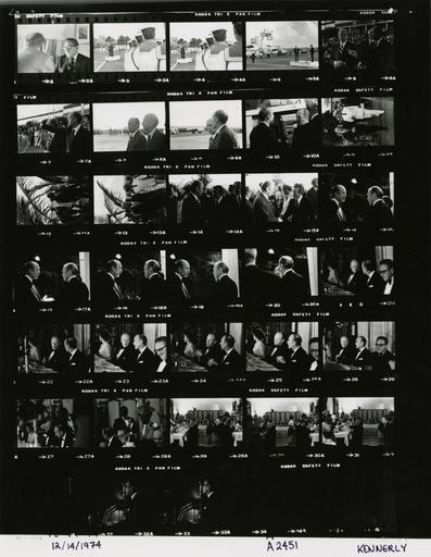 | Keywords: Ford A2451 NLGRF photo contact sheet (1974-12-14)(Gerald Ford Library).jpg White House Photographic Office WHPO is housed at the Gerald R Ford Presidential Library a branch of the National Archives and Records Administration NARA <br/><br/> This file is a 200 dpi photo contact sheet having images from roll of film A2451 of the August 9 1974 - January 20 1977 Gerald R Ford White House Photographic Office Series A0001-A9999 and B0001-B2886 photographs <br/><br/> The date on the photo contact sheet is the date the roll of film was processed not necessarily the date the photographs were taken See table below for additional details 1974-12-14 Gerald R Ford Presidential Library Image http //www fordlibrarymuseum gov/library/whphotos/A2451_NLGRF jpg A2451_NLGRF jpg from http //www fordlibrarymuseum gov/library/whphotos/19741214whpo pdf White House Photographs December 14 1974 of the http //www fordlibrarymuseum gov/Library/whphotos/whpo asp White House Photographic Collection page White House Photographic Office WHPO <br/> Creator David Hume Kennerly PD-USGov Institution Institution Gerald R Ford Presidential Library Table wikitable sortable + Photo contact sheet A2451 U S President Ford Administration Gerald R Ford Library Frame s Tone Subject proper Subject generic Names Geographic Location Photographer Date - 2 BW Flight from White House to Andrews Air Force Base seated talking; copter GRF Kissinger Marine One Kennerly 1974-12-14 - 3-4 BW Trip to Martinique - Arrival Ceremony Prior to Summit Meeting with President of the Republic of France standing on tarmac; Guard in foreground GRF Valery Giscard d'Estaing Honor Guard Martinique French West Indies Lamentin Airport Kennerly 1974-12-14 - 5 BW Trip to Martinique - Arrival Ceremony Prior to Summit Meeting with President of the Republic of France standing on platform; helicopters and terminal in background GRF Valery Giscard d'Estaing Martinique French West Indies Lamentin Airport Kennerly 1974-12-14 - 6-7 BW Trip to Martinique - Arrival Ceremony Prior to Summit Meeting with President of the Republic of France walking talking - crowd in background GRF Valery Giscard d'Estaing Crowd Martinique French West Indies Lamentin Airport Kennerly 1974-12-14 - 8-9 BW Trip to Martinique - Arrival Ceremony Prior to Summit Meeting with President of the Republic of France walking talking GRF Valery Giscard d'Estaing Martinique French West Indies Lamentin Airport Kennerly 1974-12-14 - 10 BW Trip to Martinique - Arrival Ceremony Prior to Summit Meeting with President of the Republic of France standing talking near helicopter GRF Valery Giscard d'Estaing Martinique French West Indies Lamentin Airport Kennerly 1974-12-14 - 11-13 BW Trip to Martinique - Arrival at Hotel walking talking GRF French Naval Officer Martinique French West Indies Meridien Hotel - Outside Kennerly 1974-12-14 - 14-15 BW Trip to Martinique - Arrival at Hotel greeting handshaking GRF Others Martinique French West Indies Meridien Hotel - Outside Kennerly 1974-12-14 - 16-20 BW Trip to Martinique - Arrival for Dinner Hosted by the President and First Lady of the Republic of France standing talking; head and shoulder shots; formal wear; all not in every frame GRF Valery Giscard d'Estaing Martinique French West Indies Prefect's Residence Kennerly 1974-12-14 - 21-28 BW Trip to Martinique - Dinner Hosted by the President and First Lady of the Republic of France seated at table talking - only GRF and Giscard d' Estaing in every frame; formal wear GRF Valery Giscard d'Estaing Anne-Aymone Giscard d'Estaing Kissinger Others Martinique French West Indies Prefect's Residence Kennerly 1974-12-14 - 29-31 BW Trip to Martinique - Dinner Hosted by the President and First Lady of the Republic of France seated at table talking - long shots from back of room; formal wear GRF Valery Giscard d'Estaing Anne-Aymone Giscard d'Estaing Kissinger Others Martinique French West Indies Prefect's Residence Kennerly 1974-12-14 - 32-33 BW Trip to Martinique - Dinner Hosted by the President and First Lady of the Republic of France standing at podium making speech - close-up left side profile; formal wear Valery Giscard d'Estaing Martinique French West Indies Prefect's Residence Kennerly 1974-12-14 Gerald R Ford Presidential Library and Museum-cooperation PD-USGov Contact sheets by the Ford White House December 1974 Photographs by David Hume Kennerly from 1974 |