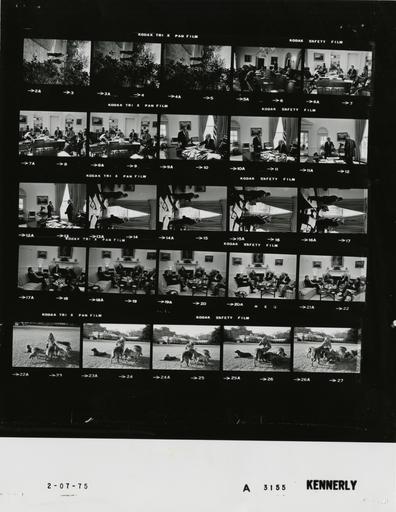 Keywords: Ford A3155 NLGRF photo contact sheet (1975-02-07)(Gerald Ford Library).jpg White House Photographic Office WHPO is housed at the Gerald R Ford Presidential Library a branch of the National Archives and Records Administration NARA <br/><br/> This file is a 200 dpi photo contact sheet having images from roll of film A3155 of the August 9 1974 - January 20 1977 Gerald R Ford White House Photographic Office Series A0001-A9999 and B0001-B2886 photographs <br/><br/> The date on the photo contact sheet is the date the roll of film was processed not necessarily the date the photographs were taken See table below for additional details 1975-02-07 Gerald R Ford Presidential Library Image http //www fordlibrarymuseum gov/library/whphotos/A3155_NLGRF jpg A3155_NLGRF jpg from http //www fordlibrarymuseum gov/library/whphotos/19750207whpo pdf White House Photographs February 7 1975 of the http //www fordlibrarymuseum gov/Library/whphotos/whpo asp White House Photographic Collection page White House Photographic Office WHPO <br/> Creator David Hume Kennerly PD-USGov Institution Institution Gerald R Ford Presidential Library Table wikitable sortable + Photo contact sheet A3155 U S President Ford Administration Gerald R Ford Library Frame s Tone Subject proper Subject generic Names Geographic Location Photographer Date - 3-5 BW standing talking; taken from inside Oval Office GRF Keiser Sidewalk Between Oval Office and South Driveway Kennerly 1975-02-07 - 6 BW Meeting to Discuss Energy Program seated around table; all not in frame GRF Porter Seidman Marsh Zarb Morton Greenspan Others Cabinet Room Kennerly 1975-02-07 - 10-17 BW Prior to Receiving Shultz Report on recent Energy Meeting in Germany and Shah Meeting in Switzerland moving around room GRF Kissinger Oval Office Kennerly 1975-02-07 - 18-22 BW Receive Shultz Report on recent Energy Meeting in Germany and Shah Meeting in Switzerland; Bechtel V P Shultz; UnderSecState Econ Affairs Robinson GRF Shultz seated in chairs by fireplace others on sofas GRF George Shultz Charles Robinson Kissinger Scowcroft Oval Office Kennerly 1975-02-07 - 23-27 BW Birthday Party for Pet Golden Retriever dogs playing on lawn; White House and Old Executive Office Building OEOB in background Susan Ford Liberty Other Dogs South Lawn Kennerly 1975-02-07 - 7-9 BW Meeting to Discuss Unemployment seated around desk all not in every frame; various angles and distances GRF Nessen Hartmann Cavanaugh Lynn O'Neill Marsh Friedersdorf Rumsfeld Greenspan Cheney Oval Office Kennerly 1975-02-07 Gerald R Ford Presidential Library and Museum-cooperation PD-USGov Contact sheets by the Ford White House February 1975 Photographs by David Hume Kennerly from 1975 |