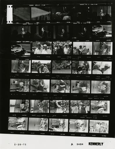 | Keywords: Ford A3434 NLGRF photo contact sheet (1975-02-25)(Gerald Ford Library).jpg White House Photographic Office WHPO is housed at the Gerald R Ford Presidential Library a branch of the National Archives and Records Administration NARA <br/><br/> This file is a 200 dpi photo contact sheet having images from roll of film A3434 of the August 9 1974 - January 20 1977 Gerald R Ford White House Photographic Office Series A0001-A9999 and B0001-B2886 photographs <br/><br/> The date on the photo contact sheet is the date the roll of film was processed not necessarily the date the photographs were taken See table below for additional details 1975-02-25 Gerald R Ford Presidential Library Image http //www fordlibrarymuseum gov/library/whphotos/A3434_NLGRF jpg A3434_NLGRF jpg from http //www fordlibrarymuseum gov/library/whphotos/19750225whpo pdf White House Photographs February 25 1975 of the http //www fordlibrarymuseum gov/Library/whphotos/whpo asp White House Photographic Collection page White House Photographic Office WHPO <br/> Creator David Hume Kennerly PD-USGov Institution Institution Gerald R Ford Presidential Library Table wikitable sortable + Photo contact sheet A3434 U S President Ford Administration Gerald R Ford Library Frame s Tone Subject proper Subject generic Names Geographic Location Photographer Date - 1-11 BW Women's Forum on National Security GRF at podium; various distances GRF American Legion Ladies Auxiliary Washington DC Washington Hilton Hotel - International Ballroom Kennerly 1975-02-25 - 12-35 BW Trip to Florida - Jackie Gleason Inverrary Classic Celebrities Golf Tournament - Hollywood Florida standing talking performing various golf activities; all not in every frame; golf attire GRF Jackie Gleason Craig Gleason Marilyn Horwich John Montgomery Jack Gaines Eugene Scott Joseph King Jack Nicklaus Bob Hope Elliott Kahn Gleen Zakany Hollywood FL Inverrary Country Club Kennerly 1975-02-26 Gerald R Ford Presidential Library and Museum-cooperation PD-USGov Contact sheets by the Ford White House February 1975 Photographs by David Hume Kennerly from 1975 |