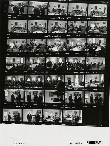 Keywords: Ford A3520 NLGRF photo contact sheet (1975-03-03)(Gerald Ford Library).jpg White House Photographic Office WHPO is housed at the Gerald R Ford Presidential Library a branch of the National Archives and Records Administration NARA <br/><br/> This file is a 200 dpi photo contact sheet having images from roll of film A3520 of the August 9 1974 - January 20 1977 Gerald R Ford White House Photographic Office Series A0001-A9999 and B0001-B2886 photographs <br/><br/> The date on the photo contact sheet is the date the roll of film was processed not necessarily the date the photographs were taken See table below for additional details 1975-03-03 Gerald R Ford Presidential Library Image http //www fordlibrarymuseum gov/library/whphotos/A3520_NLGRF jpg A3520_NLGRF jpg from http //www fordlibrarymuseum gov/library/whphotos/19750303whpo pdf White House Photographs March 3 1975 of the http //www fordlibrarymuseum gov/Library/whphotos/whpo asp White House Photographic Collection page White House Photographic Office WHPO <br/> Creator David Hume Kennerly PD-USGov Institution Institution Gerald R Ford Presidential Library Table wikitable sortable + Photo contact sheet A3520 U S President Ford Administration Gerald R Ford Library Frame s Tone Subject proper Subject generic Names Geographic Location Photographer Date - 2-3 BW Departure of President of Israel handshaking saying goodbye GRF Ephraim Katzir Amb Dinitz Sidewalk Between Oval Office and South Driveway Kennerly 1975-03-03 - 4-13 BW Meeting to Discuss Automobile Emission Standards seated talking near fireplace GRF Train Lynn Greenspan Zarb Cannon Raoul-Duval Oval Office Kennerly 1975-03-03 - 14-17 BW Breakfast for Freshman Democratic Congressmen seated around tables; GRF standing speaking in last frame GRF Rockefeller Freshman Democratic Congressmen State Dining Room Kennerly 1975-03-04 - 18 BW Following Breakfast for Freshman Democratic Congressmen seated talking White House Waiters State Dining Room Kennerly 1975-03-04 - 19-24 BW Drill Team From Stratford High School Houston Texas TX posing; all not in every frame GRF Stratford Spartanaires Cabinet Room Kennerly 1975-03-04 - 25-26 BW GRF seated at desk GRF Kissinger Oval Office Kennerly 1975-03-04 - 27-33 BW U S Ambassador-Designate to Spain greeting handshaking; all not in every frame GRF Kissinger Wells Stabler Oval Office Kennerly 1975-03-04 - 34-35 BW seated at desk GRF Kissinger Oval Office Kennerly 1975-03-04 Gerald R Ford Presidential Library and Museum-cooperation PD-USGov Contact sheets by the Ford White House March 1975 Photographs by David Hume Kennerly from 1975 |