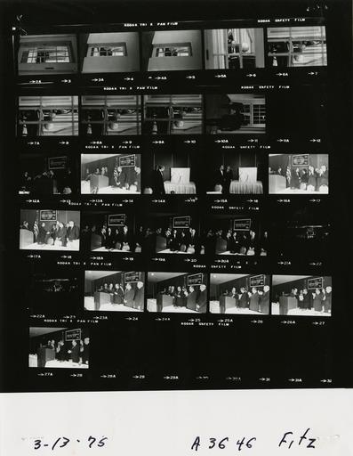 | Keywords: Ford A3646 NLGRF photo contact sheet (1975-03-13)(Gerald Ford Library).jpg White House Photographic Office WHPO is housed at the Gerald R Ford Presidential Library a branch of the National Archives and Records Administration NARA <br/><br/> This file is a 200 dpi photo contact sheet having images from roll of film A3646 of the August 9 1974 - January 20 1977 Gerald R Ford White House Photographic Office Series A0001-A9999 and B0001-B2886 photographs <br/><br/> The date on the photo contact sheet is the date the roll of film was processed not necessarily the date the photographs were taken See table below for additional details 1975-03-13 Gerald R Ford Presidential Library Image http //www fordlibrarymuseum gov/library/whphotos/A3646_NLGRF jpg A3646_NLGRF jpg from http //www fordlibrarymuseum gov/library/whphotos/19750313whpo pdf White House Photographs March 13 1975 of the http //www fordlibrarymuseum gov/Library/whphotos/whpo asp White House Photographic Collection page White House Photographic Office WHPO - Fitz-Patrick PD-USGov Institution Institution Gerald R Ford Presidential Library Table wikitable sortable + Photo contact sheet A3646 U S President Ford Administration Gerald R Ford Library Frame s Tone Subject proper Subject generic Names Geographic Location Photographer Date - 12A-17A BW Labor-Industry Banquet; First Issue Collective Bargaining Stamp; Unveil Bargaining Sculpture - Pres Continental Can Co ; Postmaster General; Chair Dir and Pres Inst of Collective Bargaining; Pres Int Assoc of Machinists; Dir Med And Concilia all not in every frame; sculpture in two frames; GRF in formal wear; onstage introduction and handshaking; viewing sculpture remarks at podium; receiving portfolio of stamps GRF Robert Hatfield Benjamin Bailar Ted Klassen Theodore Kheel William Winpisinger Floyd Smith William Usery Washington DC Statler Hilton Hotel - Congressional Room Fitz-Patrick 1975-03-13 - 2A-9A BW seated reading smoking pipe; taken through window GRF Oval Office Fitz-Patrick 1975-03-13 - 10A BW walking; backs to camera GRF Others Colonnade Fitz-Patrick 1975-03-13 - 11A BW Fitz-Patrick 1975-03-13 Gerald R Ford Presidential Library and Museum-cooperation PD-USGov Contact sheets by the Ford White House March 1975 |