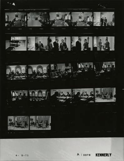 | Keywords: Ford A3978 NLGRF photo contact sheet (1975-04-09)(Gerald Ford Library).jpg White House Photographic Office WHPO is housed at the Gerald R Ford Presidential Library a branch of the National Archives and Records Administration NARA <br/><br/> This file is a 200 dpi photo contact sheet having images from roll of film A3978 of the August 9 1974 - January 20 1977 Gerald R Ford White House Photographic Office Series A0001-A9999 and B0001-B2886 photographs <br/><br/> The date on the photo contact sheet is the date the roll of film was processed not necessarily the date the photographs were taken See table below for additional details 1975-04-09 Gerald R Ford Presidential Library Image http //www fordlibrarymuseum gov/library/whphotos/A3978_NLGRF jpg A3978_NLGRF jpg from http //www fordlibrarymuseum gov/library/whphotos/19750409whpo pdf White House Photographs April 9 1975 of the http //www fordlibrarymuseum gov/Library/whphotos/whpo asp White House Photographic Collection page White House Photographic Office WHPO <br/> Creator David Hume Kennerly PD-USGov Institution Institution Gerald R Ford Presidential Library Table wikitable sortable + Photo contact sheet A3978 U S President Ford Administration Gerald R Ford Library Frame s Tone Subject proper Subject generic Names Geographic Location Photographer Date - 1A-2A BW Prior to National Security Council NSC Meeting Weyand standing Brown seated; long shots Brown Weyand Cabinet Room Kennerly 1975-04-09 - 3A-4A BW Prior to National Security Council NSC Meeting Weyand and Brown seated; others standing on opposite side of table; long shots Brown Weyand Colby Schlesinger Cabinet Room Kennerly 1975-04-09 - 5A-9A BW Chairman Jewish Agency for Israel standing talking Kissinger Max Fisher Scheduling and Advance Office Kennerly 1975-04-09 - 10A BW standing talking Nessen Kissinger Scheduling and Advance Office Kennerly 1975-04-09 - 11A-12A BW Prior to National Security Council NSC Meeting Brown and Weyand seated others standing Scowcroft Kissinger Brown Weyand Colby Cabinet Room Kennerly 1975-04-09 - 13A-17A BW National Security Council NSC Meeting seated around table; Colby pointing at map in most frames; various angles; all not in every frame GRF Kissinger Schlesinger Brown Colby Ingersoll Clements Weyand Rumsfeld Scowcroft Smyser Habib Cabinet Room Kennerly 1975-04-09 - 18A-22A BW around desk; various angles and distances; all not in every frame GRF Marsh Hartmann Kissinger Scowcroft Rumsfeld Oval Office Kennerly 1975-04-09 Gerald R Ford Presidential Library and Museum-cooperation PD-USGov Contact sheets by the Ford White House April 1975 Photographs by David Hume Kennerly from 1975 |