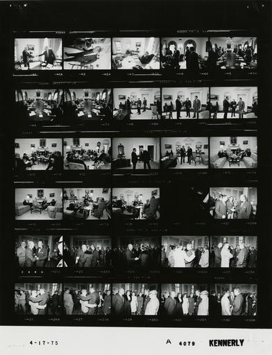 | Keywords: Ford A4079 NLGRF photo contact sheet (1975-04-17)(Gerald Ford Library).jpg White House Photographic Office WHPO is housed at the Gerald R Ford Presidential Library a branch of the National Archives and Records Administration NARA <br/><br/> This file is a 200 dpi photo contact sheet having images from roll of film A4079 of the August 9 1974 - January 20 1977 Gerald R Ford White House Photographic Office Series A0001-A9999 and B0001-B2886 photographs <br/><br/> The date on the photo contact sheet is the date the roll of film was processed not necessarily the date the photographs were taken See table below for additional details 1975-04-17 Gerald R Ford Presidential Library Image http //www fordlibrarymuseum gov/library/whphotos/A4079_NLGRF jpg A4079_NLGRF jpg from http //www fordlibrarymuseum gov/library/whphotos/19750417whpo pdf White House Photographs April 17 1975 of the http //www fordlibrarymuseum gov/Library/whphotos/whpo asp White House Photographic Collection page White House Photographic Office WHPO <br/> Creator David Hume Kennerly PD-USGov Institution Institution Gerald R Ford Presidential Library Table wikitable sortable + Photo contact sheet A4079 U S President Ford Administration Gerald R Ford Library Frame s Tone Subject proper Subject generic Names Geographic Location Photographer Date - 1 BW greeting handshaking GRF Burns Oval Office Kennerly 1975-04-17 - 2 BW closing drawer on side table; smoking pipe GRF Oval Office Kennerly 1975-04-17 - 3 BW seated around desk; Burns speaking gesturing GRF Burns Oval Office Kennerly 1975-04-17 - 4-7 BW Economy and Energy Meeting GRF entering room smoking pipe in first frame; around table in others GRF Seidman Greenspan Morton Dunlop Burns Zarb Lynn Scowcroft Gardner Marsh Dunham Rumsfeld Nessen Raoul-Duval Zausner Cheney Carlson Porter Cabinet Room Kennerly 1975-04-17 - 8-10 BW US Senators from Arkansas AR and Oklahoma OK greeting handshaking GRF Sens McClellan Bartlett Oval Office Kennerly 1975-04-17 - 11-12 BW Meeting to Discuss S1306 Authorizing a Loan to the Chicago Rock Island and Pacific Railroad near fireplace; Coleman not seen in first frame GRF Sens McClellan Bartlett Sec Coleman Cannon Patrick O'Donnell Oval Office Kennerly 1975-04-17 - 13 BW Professor of Law Yale University standing talking Kissinger Eugene Rostow Scheduling and Advance Office Kennerly 1975-04-17 - 14 BW Professor of Law Yale University greeting handshaking GRF Eugene Rostow Oval Office Kennerly 1975-04-17 - 15-18 BW Professor of Law Yale University near fireplace; various angles and distances GRF Eugene Rostow; Kissinger Oval Office Kennerly 1975-04-17 - 19 BW Kennerly 1975-04-17 - 20-30 BW Drop-by at Party in Honor of Sen Clifford Hansen of Wyoming WY greeting handshaking standing talking; all not in every frame; GRF in formal wear GRF Betty Ford Others Washington DC University Club Kennerly 1975-04-17 Gerald R Ford Presidential Library and Museum-cooperation PD-USGov Contact sheets by the Ford White House April 1975 Photographs by David Hume Kennerly from 1975 |
