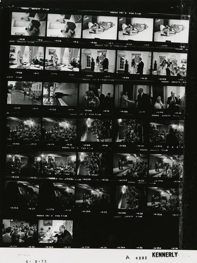 | Keywords: Ford A4392 NLGRF photo contact sheet (1975-05-06)(Gerald Ford Library).jpg White House Photographic Office WHPO is housed at the Gerald R Ford Presidential Library a branch of the National Archives and Records Administration NARA <br/><br/> This file is a 200 dpi photo contact sheet having images from roll of film A4392 of the August 9 1974 - January 20 1977 Gerald R Ford White House Photographic Office Series A0001-A9999 and B0001-B2886 photographs <br/><br/> The date on the photo contact sheet is the date the roll of film was processed not necessarily the date the photographs were taken See table below for additional details 1975-05-06 Gerald R Ford Presidential Library Image http //www fordlibrarymuseum gov/library/whphotos/A4392_NLGRF jpg A4392_NLGRF jpg from http //www fordlibrarymuseum gov/library/whphotos/19750506whpo pdf White House Photographs May 6 1975 of the http //www fordlibrarymuseum gov/Library/whphotos/whpo asp White House Photographic Collection page White House Photographic Office WHPO <br/> Creator David Hume Kennerly PD-USGov Institution Institution Gerald R Ford Presidential Library Table wikitable sortable + Photo contact sheet A4392 U S President Ford Administration Gerald R Ford Library Frame s Tone Subject proper Subject generic Names Geographic Location Photographer Date - 1A-5A BW Susan holding camera; O'Donnell in first two frames only Susan Ford O'Donnell Scheduling and Advance Office Kennerly 1975-05-06 - 6A-7A BW GRF seated at desk; SF standing holding camera GRF Susan Ford Oval Office Kennerly 1975-05-06 - 8A-10A BW Friend of Kennerly greeting handshaking; Susan Ford in last frame GRF Mariko Fukuda Oval Office Kennerly 1975-05-06 - 11A-12A BW Prior to 13th Press Conference O'Donnell and Secret Service in first frame GRF Driveway Between White House and Old Executive Office Building OEOB Kennerly 1975-05-06 - 13A-15A BW Prior to 13th Press Conference greeting handshaking GRF OEOB Employees Old Executive Office Building OEOB Kennerly 1975-05-06 - 16A-30A BW Press Conference GRF at podium; various angles and distances GRF Media Old Executive Office Building OEOB -Room 450 Kennerly 1975-05-06 - 31A BW Following 13th Press Conference standing talking GRF Media Old Executive Office Building OEOB -Room 450 Kennerly 1975-05-06 - 32A BW Following 13th Press Conference watching tape of Press Conference on television GRF Betty Ford Second Floor - West Sitting Room Kennerly 1975-05-06 Gerald R Ford Presidential Library and Museum-cooperation PD-USGov Contact sheets by the Ford White House May 1975 Photographs by David Hume Kennerly from 1975 |