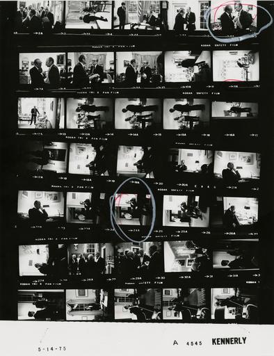 | Keywords: Ford A4545 NLGRF photo contact sheet (1975-05-14)(Gerald Ford Library).jpg White House Photographic Office WHPO is housed at the Gerald R Ford Presidential Library a branch of the National Archives and Records Administration NARA <br/><br/> This file is a 200 dpi photo contact sheet having images from roll of film A4545 of the August 9 1974 - January 20 1977 Gerald R Ford White House Photographic Office Series A0001-A9999 and B0001-B2886 photographs <br/><br/> The date on the photo contact sheet is the date the roll of film was processed not necessarily the date the photographs were taken See table below for additional details 1975-05-14 Gerald R Ford Presidential Library Image http //www fordlibrarymuseum gov/library/whphotos/A4545_NLGRF jpg A4545_NLGRF jpg from http //www fordlibrarymuseum gov/library/whphotos/19750514whpo pdf White House Photographs May 14 1975 of the http //www fordlibrarymuseum gov/Library/whphotos/whpo asp White House Photographic Collection page White House Photographic Office WHPO <br/> Creator David Hume Kennerly PD-USGov Institution Institution Gerald R Ford Presidential Library Table wikitable sortable + Photo contact sheet A4545 U S President Ford Administration Gerald R Ford Library Frame s Tone Subject proper Subject generic Names Geographic Location Photographer Date - 2A- BW Following Meeting with Bipartisan Congressional Leadership Regarding Seizure of the SS Mayaguez GRF walking past others staring ahead GRF Rep Albert Friedersdorf Others Cabinet Room Kennerly 1975-05-14 - 3A-4A BW walking toward desk GRF O'Donnell Oval Office Kennerly 1975-05-14 - 5A-9A BW Following Meeting with Bipartisan Congressional Leadership Regarding Seizure of the SS Mayaguez; US Senator from Mississippi MS Stennis poking finger into GRF's chest in two frames; GRF pounding right fist into left hand in last frame; angry expressions GRF Sen Stennis Oval Office Kennerly 1975-05-14 - 10A-12A BW BF seated talking on telephone; GRF walking bending over kissing BF; walking away GRF Betty Ford Second Floor - West Sitting Room Kennerly 1975-05-14 - 13A-16A BW Prior to Stag Dinner for the Prime Minister of the Netherlands GEF standing reading card; Barrett talking on telephone; formal wear GRF Barrett Second Floor - Center Hall Kennerly 1975-05-14 - 17A BW Prior to Stag Dinner for the Prime Minister of the Netherlands walking toward State Dining Room talking; backs to camera; formal wear GRF Johannes den Uyl Cross Hall Kennerly 1975-05-14 - 18A-27A BW Telephone Conversation Regarding Seizure of the SS Mayaguez seated talking on telephone; formal wear GRF Kissinger's West Wing Office Kennerly 1975-05-14 - 28A-30A BW Following Stag Dinner for the Prime Minister of the Netherlands standing talking; formal wear GRF Johannes den Uyl Others Red Room Kennerly 1975-05-14 - 31A-32A BW Conversation Regarding Seizure of the SS Mayaguez talking moving; HAK and Scowcroft in formal wear Kissinger Scowcroft NSC Staff Kissinger's West Wing Office Kennerly 1975-05-14 - 33A-36A BW Telephone Conversation Regarding Seizure of the SS Mayaguez standing talking on separate telephones; Scowcroft not in first frame; HAK not in last frame; formal wear Kissinger Scowcroft Kissinger's West Wing Office Kennerly 1975-05-14 Gerald R Ford Presidential Library and Museum-cooperation PD-USGov Contact sheets by the Ford White House May 1975 Photographs by David Hume Kennerly from 1975 |