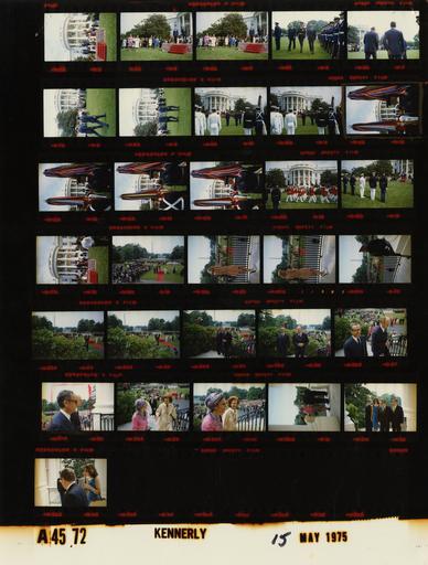 | Keywords: Ford A4572 NLGRF photo contact sheet (1975-05-15)(Gerald Ford Library).jpg White House Photographic Office WHPO is housed at the Gerald R Ford Presidential Library a branch of the National Archives and Records Administration NARA <br/><br/> This file is a 200 dpi photo contact sheet having images from roll of film A4572 of the August 9 1974 - January 20 1977 Gerald R Ford White House Photographic Office Series A0001-A9999 and B0001-B2886 photographs <br/><br/> The date on the photo contact sheet is the date the roll of film was processed not necessarily the date the photographs were taken See table below for additional details 1975-05-15 Gerald R Ford Presidential Library Image http //www fordlibrarymuseum gov/library/whphotos/A4572_NLGRF jpg A4572_NLGRF jpg from http //www fordlibrarymuseum gov/library/whphotos/19750515whpo pdf White House Photographs May 15 1975 of the http //www fordlibrarymuseum gov/Library/whphotos/whpo asp White House Photographic Collection page White House Photographic Office WHPO <br/> Creator David Hume Kennerly PD-USGov Institution Institution Gerald R Ford Presidential Library Table wikitable sortable + Photo contact sheet A4572 U S President Ford Administration Gerald R Ford Library Frame s Tone Subject proper Subject generic Names Geographic Location Photographer Date - 10-17 Color State Arrival Ceremony for the Shah of Iran backs to camera; taken toward podium; Marine Corps Band in seventh frame; GRF and White House in background Honor Guard South Lawn Kennerly 1975-05-15 - 18 Color State Arrival Ceremony for the Shah of Iran GRF addressing crowd; White House in background GRF Shah Mohammad Reza Pahlavi Crowd South Lawn Kennerly 1975-05-15 - 19 Color State Arrival Ceremony for the Shah of Iran GRF addressing crowd; Honor Guard in background; taken from Blue Room Balcony GRF Shah Mohammad Reza Pahlavi Crowd South Lawn Kennerly 1975-05-15 - 20-21 Color State Arrival Ceremony for the Shah of Iran looking over railing at ceremony; back to camera; horizontal striped dress Susan Ford Blue Room Balcony Kennerly 1975-05-15 - 22-24 Color State Arrival Ceremony for the Shah of Iran standing on podium Shah speaking; tree in foreground; FPO in first frame; taken from Blue Room Balcony GRF Shah Mohammad Reza Pahlavi South Lawn Kennerly 1975-05-15 - 3-5 Color State Arrival Ceremony for the Shah of Iran standing on podium; GRF with hand over heart; White House in background GRF Shah Mohammad Reza Pahlavi South Lawn Kennerly 1975-05-15 - 6 Color State Arrival Ceremony for the Shah of Iran walking past Honor Guard GRF Shah Mohammad Reza Pahlavi Captain of the Guard Honor Guard South Lawn Kennerly 1975-05-15 - 7-9 Color State Arrival Ceremony for the Shah of Iran walking toward podium; backs to camera GRF Shah Mohammad Reza Pahlavi South Lawn Kennerly 1975-05-15 - 25-28 Color State Arrival Ceremony for the Shah of Iran ascending steps; moving toward camera; GRF obscured in last frame GRF Shah Mohammad Reza Pahlavi Blue Room Balcony Kennerly 1975-05-15 - 29-30 Color State Arrival Ceremony for the Shah of Iran ascending steps; moving toward camera Betty Ford Shahbanou Farah Pahlavi Blue Room Balcony Kennerly 1975-05-15 - 31 Color State Arrival Ceremony for the Shah of Iran standing waving to crowd; backs to camera GRF Shah Mohammad Reza Pahlavi Betty Ford Shahbanou Farah Pahlavi Blue Room Balcony Kennerly 1975-05-15 - 32-33 Color State Arrival Ceremony for the Shah of Iran walking past camera Henry Nancy Kissinger Blue Room Balcony Kennerly 1975-05-15 Gerald R Ford Presidential Library and Museum-cooperation PD-USGov Contact sheets by the Ford White House May 1975 Photographs by David Hume Kennerly from 1975 |