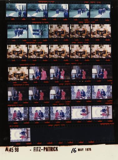 Keywords: Ford A4598 NLGRF photo contact sheet (1975-05-15)(Gerald Ford Library).jpg White House Photographic Office WHPO is housed at the Gerald R Ford Presidential Library a branch of the National Archives and Records Administration NARA <br/><br/> This file is a 200 dpi photo contact sheet having images from roll of film A4598 of the August 9 1974 - January 20 1977 Gerald R Ford White House Photographic Office Series A0001-A9999 and B0001-B2886 photographs <br/><br/> The date on the photo contact sheet is the date the roll of film was processed not necessarily the date the photographs were taken See table below for additional details 1975-05-15 Gerald R Ford Presidential Library Image http //www fordlibrarymuseum gov/library/whphotos/A4598_NLGRF jpg A4598_NLGRF jpg from http //www fordlibrarymuseum gov/library/whphotos/19750515whpo pdf White House Photographs May 15 1975 of the http //www fordlibrarymuseum gov/Library/whphotos/whpo asp White House Photographic Collection page White House Photographic Office WHPO - Fitz-Patrick PD-USGov Institution Institution Gerald R Ford Presidential Library Table wikitable sortable + Photo contact sheet A4598 U S President Ford Administration Gerald R Ford Library Frame s Tone Subject proper Subject generic Names Geographic Location Photographer Date - 3A-8A Color Departure of the Shah of Iran After First Day Meeting walking toward limousine; moving toward camera; all not in every frame GRF Shah Mohammad Reza Pahlavi Kissinger Ardeshir Zahedi Helms Catto Others Sidewalk Between Oval Office and South Driveway Fitz-Patrick 1975-05-15 - 9A Color Following Departure of the Shah of Iran After First Day Meeting - CIA Former Director-Central Intelligence Agency standing talking; Helms waving GRF Kissinger Helms Sidewalk Between Oval Office and South Driveway Fitz-Patrick 1975-05-15 - 10A-18A Color Ambassador From Republic of Turkey to the U S seated near fireplace GRF Melh Esenbel Oval Office Fitz-Patrick 1975-05-16 - 19A-25A Color Five Star Cook Book - Wife of Bob Hope standing talking; looking at cookbook Betty Ford Dolores Hope Second Floor - West Sitting Room Fitz-Patrick 1975-05-16 - 26A-33A Color Five Star Cook Book - Wife of Bob Hope seated; looking at cookbook; various distances Betty Ford Dolores Hope Second Floor - West Sitting Room Fitz-Patrick 1975-05-16 Gerald R Ford Presidential Library and Museum-cooperation PD-USGov Contact sheets by the Ford White House May 1975 |