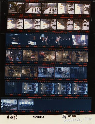 | Keywords: Ford A4805 NLGRF photo contact sheet (1975-05-31)(Gerald Ford Library).jpg White House Photographic Office WHPO is housed at the Gerald R Ford Presidential Library a branch of the National Archives and Records Administration NARA <br/><br/> This file is a 200 dpi photo contact sheet having images from roll of film A4805 of the August 9 1974 - January 20 1977 Gerald R Ford White House Photographic Office Series A0001-A9999 and B0001-B2886 photographs <br/><br/> The date on the photo contact sheet is the date the roll of film was processed not necessarily the date the photographs were taken See table below for additional details 1975-05-31 Gerald R Ford Presidential Library Image http //www fordlibrarymuseum gov/library/whphotos/A4805_NLGRF jpg A4805_NLGRF jpg from http //www fordlibrarymuseum gov/library/whphotos/19750531whpo pdf White House Photographs May 31 1975 of the http //www fordlibrarymuseum gov/Library/whphotos/whpo asp White House Photographic Collection page White House Photographic Office WHPO <br/> Creator David Hume Kennerly PD-USGov Institution Institution Gerald R Ford Presidential Library Table wikitable sortable + Photo contact sheet A4805 U S President Ford Administration Gerald R Ford Library Frame s Tone Subject proper Subject generic Names Geographic Location Photographer Date - 19-22 Color Trip to Spain - Prior to Departure of Franco walking through rooms GRF Generalissimo Francisco Franco Kissinger Others Madrid Spain Moncloa Palace Kennerly 1975-05-31 - 1-10 Color Trip to Spain - Ceremonial Parade to the Moncloa Palace GRF and Franco riding in Rolls-Royce R-R Phantom IV; standing waving; Guard surrounding car; various angles and distances GRF Generalissimo Francisco Franco; Mounted Ceremonial Guard; Crowd Madrid Spain Ceremonial Parade Route Kennerly 1975-05-31 - 12 Color Trip to Spain - Prior to Departure of Franco GRF and Franco talking handshaking GRF Generalissimo Francisco Franco Others Madrid Spain Moncloa Palace Kennerly 1975-05-31 - 13-15 Color Trip to Spain - Visit with Prime Minister and Foreign Minister of Spain standing seated; talking; all may not be in frame GRF Prime Minister Carlos Arias Navaero Pedro Cortina Kissinger Madrid Spain Moncloa Palace Kennerly 1975-05-31 - 16 Color Trip to Spain-First Betty Ford and Mrs Franco seated talking; walking through rooms Betty Ford Carmen Franco entourage press Madrid Spain Moncloa Palace Kennerly 1975-05-31 - 23-26 Color Trip to Spain - Arrival for Meeting with Generalissimo Franco descending steps; guard flanking; walking through room GRF Chief of the Military Household Chief of the Civilian Household; Honor Guard Madrid Spain El Pardo Palace - Goya Room Kennerly 1975-05-31 - 27-32 Color Trip to Spain - Working Luncheon with Spanish Prime Minister and Foreign Minister GRF and Arias standing talking first four frames; seated around large rectangular table in remaining frames; all not in last 2 frames frame GRF Carlos Arias Navaero; Kissinger Amb Stabler Rumsfeld Hartmann Nessen Sonnenfeldt Scowcroft Col Dixon Samuel Eaton; Rafael Cabello de Alba; Pedro Mauri Francisco Gallegos gabriel da Viega Mariano Median Antonio Martinez Others Madrid Spain Moncloa Palace - Salon de Columnas Kennerly 1975-05-31 Gerald R Ford Presidential Library and Museum-cooperation PD-USGov Contact sheets by the Ford White House May 1975 Photographs by David Hume Kennerly from 1975 |