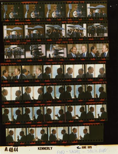 | Keywords: Ford A4844 NLGRF photo contact sheet (1975-06-02)(Gerald Ford Library).jpg White House Photographic Office WHPO is housed at the Gerald R Ford Presidential Library a branch of the National Archives and Records Administration NARA <br/><br/> This file is a 200 dpi photo contact sheet having images from roll of film A4844 of the August 9 1974 - January 20 1977 Gerald R Ford White House Photographic Office Series A0001-A9999 and B0001-B2886 photographs <br/><br/> The date on the photo contact sheet is the date the roll of film was processed not necessarily the date the photographs were taken See table below for additional details 1975-06-02 Gerald R Ford Presidential Library Image http //www fordlibrarymuseum gov/library/whphotos/A4844_NLGRF jpg A4844_NLGRF jpg from http //www fordlibrarymuseum gov/library/whphotos/19750602whpo pdf White House Photographs June 2 1975 of the http //www fordlibrarymuseum gov/Library/whphotos/whpo asp White House Photographic Collection page White House Photographic Office WHPO <br/> Creator David Hume Kennerly PD-USGov Institution Institution Gerald R Ford Presidential Library Table wikitable sortable + Photo contact sheet A4844 U S President Ford Administration Gerald R Ford Library Frame s Tone Subject proper Subject generic Names Geographic Location Photographer Date - 4-14 Color Trip to Austria - Joint Press Conference Following First Meeting with President of Egypt GRF and Sadat speaking at microphone under umbrellas; various angles and distances GRF Anwar Al-Sadat Entourage Media Salzburg Austria Residenz -Courtyard Kennerly 1975-06-02 - 15-16 Color Trip to Austria - Following First Meeting with President of Egypt walking talking; under umbrellas; moving toward camera GRF Anwar Al-Sadat Others Salzburg Austria Residenz -Courtyard Kennerly 1975-06-02 - 17-20 Color Trip to Austria - Meeting with President of Egypt close ups; head and shoulder portrait s GRF Anwar Al-Sadat Salzburg Austria Hotel Schloss Klessheim Kennerly 1975-06-02 - 21-337 Color Trip to Austria - Meeting with President of Egypt talking Sadat gesturing; window in background; close ups; head and shoulder silhouette portrait s GRF Anwar Al-Sadat Salzburg Austria Hotel Schloss Klessheim Kennerly 1975-06-02 Gerald R Ford Presidential Library and Museum-cooperation PD-USGov Contact sheets by the Ford White House June 1975 Photographs by David Hume Kennerly from 1975 |