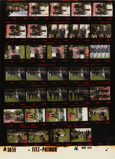 | Keywords: Ford A5059 NLGRF photo contact sheet (1975-06-16)(Gerald Ford Library).jpg White House Photographic Office WHPO is housed at the Gerald R Ford Presidential Library a branch of the National Archives and Records Administration NARA <br/><br/> This file is a 200 dpi photo contact sheet having images from roll of film A5059 of the August 9 1974 - January 20 1977 Gerald R Ford White House Photographic Office Series A0001-A9999 and B0001-B2886 photographs <br/><br/> The date on the photo contact sheet is the date the roll of film was processed not necessarily the date the photographs were taken See table below for additional details 1975-06-16 Gerald R Ford Presidential Library Image http //www fordlibrarymuseum gov/library/whphotos/A5059_NLGRF jpg A5059_NLGRF jpg from http //www fordlibrarymuseum gov/library/whphotos/19750616whpo pdf White House Photographs June 16 1975 of the http //www fordlibrarymuseum gov/Library/whphotos/whpo asp White House Photographic Collection page White House Photographic Office WHPO - Fitz-Patrick PD-USGov Institution Institution Gerald R Ford Presidential Library Table wikitable sortable + Photo contact sheet A5059 U S President Ford Administration Gerald R Ford Library Frame s Tone Subject proper Subject generic Names Geographic Location Photographer Date - 2 Color State Arrival Ceremony for the President Federal Republic of Germany greeting near limousine; roof in foreground Betty Ford Mildred Scheel South Driveway Fitz-Patrick 1975-06-16 - 3-11 Color State Arrival Ceremony for the President Federal Republic of Germany standing on podium for anthems; GRF with hand over heart in final 8 frames; White House in background GRF Walter Scheel South Lawn Fitz-Patrick 1975-06-16 - 12-15 Color State Arrival Ceremony for the President Federal Republic of Germany standing for anthems; Mrs Scheel holding bouquet Betty Ford Mildred Scheel South Lawn Fitz-Patrick 1975-06-16 - 16 Color State Arrival Ceremony for the President Federal Republic of Germany standing at attention Marine Honor Guard South Lawn Fitz-Patrick 1975-06-16 - 17-25 Color State Arrival Ceremony for the President Federal Republic of Germany GRF and Scheel walking past Guard; moving toward camera GRF Walter Scheel Captain of Guard Honor Guard South Lawn Fitz-Patrick 1975-06-16 - 26-30 Color State Arrival Ceremony for the President Federal Republic of Germany standing on podium; various angles and distances; last 3 frames taken from Balcony GRF Walter Scheel South Lawn Fitz-Patrick 1975-06-16 - 31-33 Color State Arrival Ceremony for the President Federal Republic of Germany GRF at podium speaking; facing media; Honor Guard and Washington Monument in background; taken from Blue Room Balcony Stairs GRF Walter Scheel Media Honor Guard South Lawn Fitz-Patrick 1975-06-16 - 34 Color State Arrival Ceremony for the President Federal Republic of Germany standing Mrs Scheel holding bouquet Betty Ford Mildred Scheel South Lawn Fitz-Patrick 1975-06-16 - 35 Color State Arrival Ceremony for the President Federal Republic of Germany Scheel at podium speaking; facing media GRF Walter Scheel Media South Lawn Fitz-Patrick 1975-06-16 Gerald R Ford Presidential Library and Museum-cooperation PD-USGov Contact sheets by the Ford White House June 1975 |