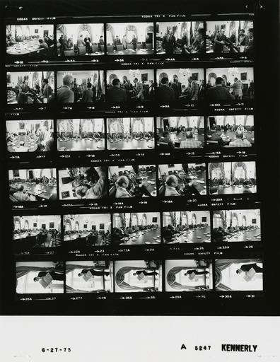 | Keywords: Ford A5247 NLGRF photo contact sheet (1975-06-26)(Gerald Ford Library).jpg White House Photographic Office WHPO is housed at the Gerald R Ford Presidential Library a branch of the National Archives and Records Administration NARA <br/><br/> This file is a 200 dpi photo contact sheet having images from roll of film A5247 of the August 9 1974 - January 20 1977 Gerald R Ford White House Photographic Office Series A0001-A9999 and B0001-B2886 photographs <br/><br/> The date on the photo contact sheet is the date the roll of film was processed not necessarily the date the photographs were taken See table below for additional details 1975-06-26 Gerald R Ford Presidential Library Image http //www fordlibrarymuseum gov/library/whphotos/A5247_NLGRF jpg A5247_NLGRF jpg from http //www fordlibrarymuseum gov/library/whphotos/19750626whpo pdf White House Photographs June 26 1975 of the http //www fordlibrarymuseum gov/Library/whphotos/whpo asp White House Photographic Collection page White House Photographic Office WHPO <br/> Creator David Hume Kennerly PD-USGov Institution Institution Gerald R Ford Presidential Library Table wikitable sortable + Photo contact sheet A5247 U S President Ford Administration Gerald R Ford Library Frame s Tone Subject proper Subject generic Names Geographic Location Photographer Date - 1A BW Meeting to Discuss Military Assistance to Republic of Turkey seated at table; all not in frame GRF Reps Anderson Albert Broomfield Fascell Hamilton Hayy McFall Michel Morgan Tip O'Neill Rhodes Zablocki Buchanan Price; Kissinger Schlesinger R McCloskey Marsh Rumsfeld Scowcroft Friedersdorf Wolthius Cabinet Room Kennerly 1975-06-26 - 2A-11A BW Prior to Meeting of Transition Team greeting handshaking moving around table; all not in every frame GRF Byrnes Griffin Laird Whyte Scranton Parma Buchen Marsh Hartmann Rumsfeld Seidman Cheney Cabinet Room Kennerly 1975-06-26 - 12A-25A BW Meeting of Transition Team seated around table; all not in every frame GRF Byrnes Griffin Laird Whyte Scranton Parma Buchen Marsh Hartmann Rumsfeld Seidman Cheney Cabinet Room Kennerly 1975-06-26 - 26A-20A BW standing near window reading The Wall Street Journal Greenspan Cabinet Room Kennerly 1975-06-26 Gerald R Ford Presidential Library and Museum-cooperation PD-USGov Contact sheets by the Ford White House June 1975 Photographs by David Hume Kennerly from 1975 |