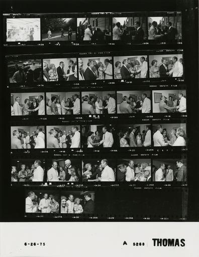 Keywords: Ford A5268 NLGRF photo contact sheet (1975-06-27)(Gerald Ford Library).jpg White House Photographic Office WHPO is housed at the Gerald R Ford Presidential Library a branch of the National Archives and Records Administration NARA <br/><br/> This file is a 200 dpi photo contact sheet having images from roll of film A5268 of the August 9 1974 - January 20 1977 Gerald R Ford White House Photographic Office Series A0001-A9999 and B0001-B2886 photographs <br/><br/> The date on the photo contact sheet is the date the roll of film was processed not necessarily the date the photographs were taken See table below for additional details 1975-06-27 Gerald R Ford Presidential Library Image http //www fordlibrarymuseum gov/library/whphotos/A5268_NLGRF jpg A5268_NLGRF jpg from http //www fordlibrarymuseum gov/library/whphotos/19750627whpo pdf White House Photographs June 27 1975 of the http //www fordlibrarymuseum gov/Library/whphotos/whpo asp White House Photographic Collection page White House Photographic Office WHPO - Thomas PD-USGov Institution Institution Gerald R Ford Presidential Library Table wikitable sortable + Photo contact sheet A5268 U S President Ford Administration Gerald R Ford Library Frame s Tone Subject proper Subject generic Names Geographic Location Photographer Date - 2 BW Thomas 1975-06-27 - 3 BW walking quickly toward driveway; O'Donnell cutting across lawn GRF Barrett O'Donnell Sidewalk Between Oval Office and South Driveway Thomas 1975-06-27 - 4-7 BW Arrival for Wedding Reception for Daughter of Harveys greeting handshaking; walking up steps GRF Mr Mrs John C Harvey Washington DC Army and Navy Club - Outside Thomas 1975-06-27 - 8-28 BW Wedding Reception for Daughter of Harveys greeting handshaking standing talking; all not in every frame GRF Mr Mrs John C Harvey Guests Washington DC Army and Navy Club Thomas 1975-06-27 Gerald R Ford Presidential Library and Museum-cooperation PD-USGov Contact sheets by the Ford White House June 1975 |