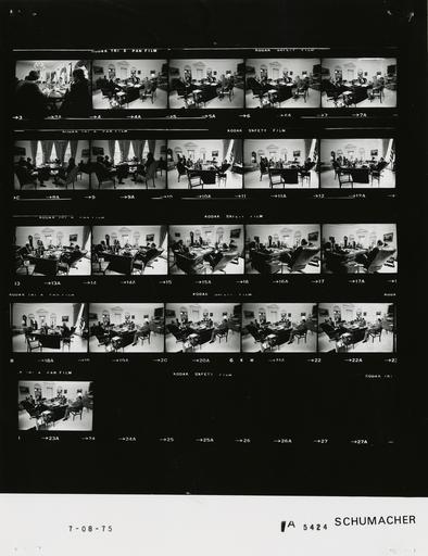 Keywords: Ford A5424 NLGRF photo contact sheet (1975-07-08)(Gerald Ford Library).jpg White House Photographic Office WHPO is housed at the Gerald R Ford Presidential Library a branch of the National Archives and Records Administration NARA <br/><br/> This file is a 200 dpi photo contact sheet having images from roll of film A5424 of the August 9 1974 - January 20 1977 Gerald R Ford White House Photographic Office Series A0001-A9999 and B0001-B2886 photographs <br/><br/> The date on the photo contact sheet is the date the roll of film was processed not necessarily the date the photographs were taken See table below for additional details 1975-07-08 Gerald R Ford Presidential Library Image http //www fordlibrarymuseum gov/library/whphotos/A5424_NLGRF jpg A5424_NLGRF jpg from http //www fordlibrarymuseum gov/library/whphotos/19750708whpo pdf White House Photographs July 8 1975 of the http //www fordlibrarymuseum gov/Library/whphotos/whpo asp White House Photographic Collection page White House Photographic Office WHPO - Schumacher PD-USGov Institution Institution Gerald R Ford Presidential Library Table wikitable sortable + Photo contact sheet A5424 U S President Ford Administration Gerald R Ford Library Frame s Tone Subject proper Subject generic Names Geographic Location Photographer Date - 3A BW Date is Not Correct seated around table GRF Friedersdorf Cannon Others Cabinet Room Schumacher 1975-07-08 - 4A-17A BW Vice President Union Oil Company seated around desk; various angles and distances GRF Greenspan Zarb Brinegar Oval Office Schumacher 1975-07-08 - 18A-23A BW Representative from New York NY seated around desk; various angles and distances GRF Rep Conable Rumsfeld Oval Office Schumacher 1975-07-08 Gerald R Ford Presidential Library and Museum-cooperation PD-USGov Contact sheets by the Ford White House July 1975 |