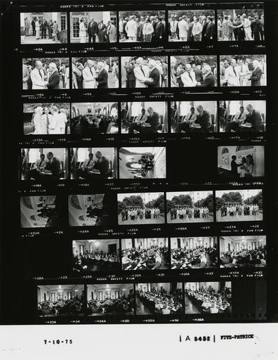 | Keywords: Ford A5432 NLGRF photo contact sheet (1975-07-09)(Gerald Ford Library).jpg White House Photographic Office WHPO is housed at the Gerald R Ford Presidential Library a branch of the National Archives and Records Administration NARA <br/><br/> This file is a 200 dpi photo contact sheet having images from roll of film A5432 of the August 9 1974 - January 20 1977 Gerald R Ford White House Photographic Office Series A0001-A9999 and B0001-B2886 photographs <br/><br/> The date on the photo contact sheet is the date the roll of film was processed not necessarily the date the photographs were taken See table below for additional details 1975-07-09 Gerald R Ford Presidential Library Image http //www fordlibrarymuseum gov/library/whphotos/A5432_NLGRF jpg A5432_NLGRF jpg from http //www fordlibrarymuseum gov/library/whphotos/19750709whpo pdf White House Photographs July 9 1975 of the http //www fordlibrarymuseum gov/Library/whphotos/whpo asp White House Photographic Collection page White House Photographic Office WHPO - Fitz-Patrick PD-USGov Institution Institution Gerald R Ford Presidential Library Table wikitable sortable + Photo contact sheet A5432 U S President Ford Administration Gerald R Ford Library Frame s Tone Subject proper Subject generic Names Geographic Location Photographer Date - 3A-13A BW Following Signing Ceremony for S 2003 The International Travel Amendments Act greeting handshaking talking embracing; all not in frames GRF Representatives Senators Guests Rose Garden Fitz-Patrick 1975-07-09 - 14A BW Meeting to Discuss Regulatory Reform seated around table; all may not be in frame GRF Lynn Seidman Cannon Greenspan MacAvoy R Hills Nessen Rumsfeld Cheney Cabinet Room Fitz-Patrick 1975-07-09 - 15A-20A BW Breakfast Meeting with Members of Congress to Discuss Military Aid to Republic of Turkey - US Senator from Oregon OR seated in chairs near window talking; GRF writing; last frame long shot GRF Sen Hatfield Cabinet Room Fitz-Patrick 1975-07-10 - 21A BW Fitz-Patrick 1975-07-10 - 22A-24A BW Unidentified Man; Two Unidentified Women East Colonnade Fitz-Patrick 1975-07-10 - 25A-27A BW standing posing Unidentified Group of Men Jacqueline Kennedy Garden Fitz-Patrick 1975-07-10 - 28A BW Fitz-Patrick 1975-07-10 - 29A-36A BW Meeting with Chairmen and Commissioners of the Independent Regulatory Agencies seated around long table; others seated against wall; all not in every frame; various angles and distances GRF Chairmen Commissioners of the Independent Regulatory Agencies; Staff East Room Fitz-Patrick 1975-07-10 Gerald R Ford Presidential Library and Museum-cooperation PD-USGov Contact sheets by the Ford White House July 1975 |