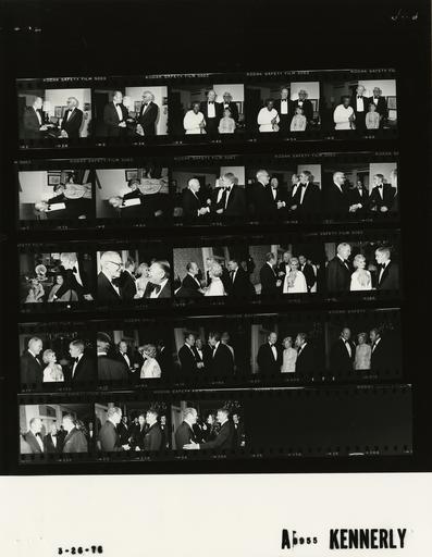 Keywords: Ford A8955 NLGRF photo contact sheet (1976-03-26)(Gerald Ford Library).jpg White House Photographic Office WHPO is housed at the Gerald R Ford Presidential Library a branch of the National Archives and Records Administration NARA <br/><br/> This file is a 200 dpi photo contact sheet having images from roll of film A8955 of the August 9 1974 - January 20 1977 Gerald R Ford White House Photographic Office Series A0001-A9999 and B0001-B2886 photographs <br/><br/> The date on the photo contact sheet is the date the roll of film was processed not necessarily the date the photographs were taken See table below for additional details 1976-03-26 Gerald R Ford Presidential Library Image http //www fordlibrarymuseum gov/library/whphotos/A8955_NLGRF jpg A8955_NLGRF jpg from http //www fordlibrarymuseum gov/library/whphotos/19760326whpo pdf White House Photographs March 26 1976 of the http //www fordlibrarymuseum gov/Library/whphotos/whpo asp White House Photographic Collection page White House Photographic Office WHPO <br/> Creator David Hume Kennerly PD-USGov thumb left 200px GRF posing with Cary and Jennifer Grant and maid Willie Institution Institution Gerald R Ford Presidential Library Table wikitable sortable + Photo contact sheet A8955 U S President Ford Administration Gerald R Ford Library Frame s Tone Subject proper Subject generic Names Geographic Location Photographer Date - 2A-8A BW Campaign Trip to California-Visit by Actor Cary Grant; Entertainer GRF posing with Grant Grant's daughter and maid Willie ; formal wear GRF Cary Grant; Jennifer Grant maid Willie Los Angeles CA Century Plaza Hotel - President's Suite Kennerly 1976-03-26 - 9A BW Campaign Trip to California-Escort Presidential Dinner Chrm Member GenAdvisory Committee on Arms Control and Disarmament Hendy Internat Board Chrm McCone handshaking; formal wear GRF John McCone Steve Ford Los Angeles CA Century Plaza Hotel - President's Suite Kennerly 1976-03-26 - 10A-11A BW Campaign Trip to California-Escorts; California PFC Finance Chrm Pres Carter Hawley Hale department stores Carter standing together; ; all not in every frame; formal wear GRF Edward Carter John McCone Steve Ford Los Angeles CA Century Plaza Hotel - President's Suite Kennerly 1976-03-26 - 12A BW Campaign Trip to California; Actor and Entertainer -Los Angeles California handshaking Steve Ford Cary Grant; formal wear Los Angeles CA Century Plaza Hotel - President's Suite Kennerly 1976-03-26 - 13A BW Campaign Trip to California; Actor and Entertainer -Los Angeles California greeting Cary Grant's daughter Steve Ford Jennifer Grant; formal wear Los Angeles CA Century Plaza Hotel - President's Suite Kennerly 1976-03-26 - 14A-25A BW Campaign Trip to California-President Ford Committee Southern California Presidential Dinner Vice Chairmen Reception; Entertainers GRF in receiving line handshaking; various angles and distances; all not in every frame; formal wear GRF Zsa Zsa Gabor; Glenn Ford Other Guests Los Angeles CA Century Plaza Hotel - Pacific Palisades Room Kennerly 1976-03-26 Gerald R Ford Presidential Library and Museum-cooperation PD-USGov Glenn Ford Steven Ford Zsa Zsa Gabor Cary Grant Jennifer Grant John McCone Gerald Ford presidential campaign 1976 Gerald Ford shaking hands Photographs by David Hume Kennerly from 1976 Contact sheets by the Ford White House March 1976 Century Plaza Hotel |