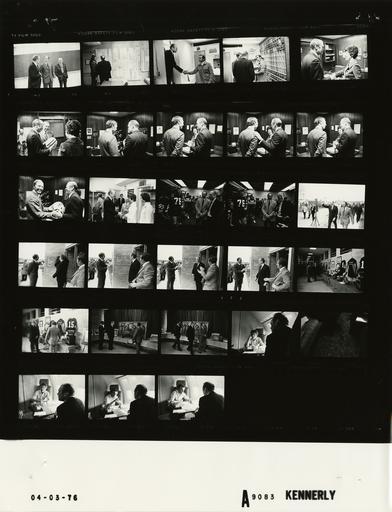 | Keywords: Ford A9083 NLGRF photo contact sheet (1976-04-02)(Gerald Ford Library).jpg White House Photographic Office WHPO is housed at the Gerald R Ford Presidential Library a branch of the National Archives and Records Administration NARA <br/><br/> This file is a 200 dpi photo contact sheet having images from roll of film A9083 of the August 9 1974 - January 20 1977 Gerald R Ford White House Photographic Office Series A0001-A9999 and B0001-B2886 photographs <br/><br/> The date on the photo contact sheet is the date the roll of film was processed not necessarily the date the photographs were taken See table below for additional details 1976-04-02 Gerald R Ford Presidential Library Image http //www fordlibrarymuseum gov/library/whphotos/A9083_NLGRF jpg A9083_NLGRF jpg from http //www fordlibrarymuseum gov/library/whphotos/19760402whpo pdf White House Photographs April 2 1976 of the http //www fordlibrarymuseum gov/Library/whphotos/whpo asp White House Photographic Collection page White House Photographic Office WHPO <br/> Creator David Hume Kennerly PD-USGov Institution Institution Gerald R Ford Presidential Library Table wikitable sortable + Photo contact sheet A9083 U S President Ford Administration Gerald R Ford Library Frame s Tone Subject proper Subject generic Names Geographic Location Photographer Date - 26A-30A BW Campaign Trip to Wisconsin; Aboard Air Force One; Speechwriter and humorist Orben ; Consultant and humorist Penny seated on plane talking; Orben not shown GRF Don Penny Schneider; Robert Orben Air Force One Kennerly 1976-04-02 - 3A-17A BW Campaign Trip to Wisconsin; Tour of Green Bay Packers Headquarters; football team members; Coach and General Manager Starr President GBP Corp Olejniczak standing together looking at paperwork on wall; handshaking with film archivist staff; GRF holding helmet; visiting with team members in Nautilus room 26 and 76 GRF Bart Starr Staff Dominic Olejniczak Zeke Bratkowski Dominic Gentile Others Green Bay WI Green Bay Packers Football Team Headquarters Kennerly 1976-04-03 - 18A-25A BW Campaign Trip to Wisconsin; Dedication Ceremony Green Bay Packers Hall of Fame walking together outside; standing by dedication plaque on corner of building; touring memorabilia exhibits inside GRF Bart Starr Tom Hutchinson Media Green Bay WI Green Bay Packers Hall of Fame Kennerly 1976-04-03 Gerald R Ford Presidential Library and Museum-cooperation PD-USGov Contact sheets by the Ford White House April 1976 Photographs by David Hume Kennerly from 1976 |