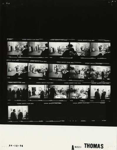| Keywords: Ford A9221 NLGRF photo contact sheet (1976-04-12)(Gerald Ford Library).jpg White House Photographic Office WHPO is housed at the Gerald R Ford Presidential Library a branch of the National Archives and Records Administration NARA <br/><br/> This file is a 200 dpi photo contact sheet having images from roll of film A9221 of the August 9 1974 - January 20 1977 Gerald R Ford White House Photographic Office Series A0001-A9999 and B0001-B2886 photographs <br/><br/> The date on the photo contact sheet is the date the roll of film was processed not necessarily the date the photographs were taken See table below for additional details 1976-04-12 Gerald R Ford Presidential Library Image http //www fordlibrarymuseum gov/library/whphotos/A9221_NLGRF jpg A9221_NLGRF jpg from http //www fordlibrarymuseum gov/library/whphotos/19760412whpo pdf White House Photographs April 12 1976 of the http //www fordlibrarymuseum gov/Library/whphotos/whpo asp White House Photographic Collection page White House Photographic Office WHPO - Thomas PD-USGov Institution Institution Gerald R Ford Presidential Library Table wikitable sortable + Photo contact sheet A9221 U S President Ford Administration Gerald R Ford Library Frame s Tone Subject proper Subject generic Names Geographic Location Photographer Date - 3A-13A BW Reception for President Ford Committee PFC Staff and Volunteers Republican National Committee Staff and White House Staff- Remarks; PFC Chairman Morton standing onstage; Morton introduces GRF; GRF remarks; BF remarks; departing platform handshaking GRF Betty Ford Morton East Room Thomas 1976-04-12 - 14A BW Reception for President Ford Committee PFC Staff and Volunteers Republican National Committee Staff and White House Staff walking to State Dining Room GRF Betty Ford Others Cross Hall Thomas 1976-04-12 - 15A-16A BW Reception for President Ford Committee PFC Staff and Volunteers Republican National Committee Staff and White House Staff standing by buffet table eating; waiter carving meat GRF Cheney Jim Connor Others Waiter State Dining Room Thomas 1976-04-12 - 17A-18A BW Reception for President Ford Committee PFC Staff and Volunteers Republican National Committee Staff and White House Staff - Special Assistant to the President for Minority Affairs standing talking GRF John Calhoun State Dining Room Thomas 1976-04-12 Gerald R Ford Presidential Library and Museum-cooperation PD-USGov Contact sheets by the Ford White House April 1976 |