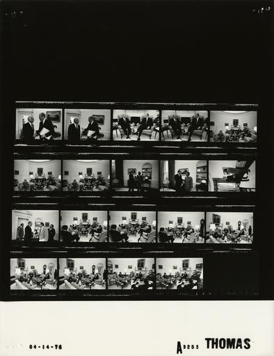 | Keywords: Ford A9253 NLGRF photo contact sheet (1976-04-14)(Gerald Ford Library).jpg White House Photographic Office WHPO is housed at the Gerald R Ford Presidential Library a branch of the National Archives and Records Administration NARA <br/><br/> This file is a 200 dpi photo contact sheet having images from roll of film A9253 of the August 9 1974 - January 20 1977 Gerald R Ford White House Photographic Office Series A0001-A9999 and B0001-B2886 photographs <br/><br/> The date on the photo contact sheet is the date the roll of film was processed not necessarily the date the photographs were taken See table below for additional details 1976-04-14 Gerald R Ford Presidential Library Image http //www fordlibrarymuseum gov/library/whphotos/A9253_NLGRF jpg A9253_NLGRF jpg from http //www fordlibrarymuseum gov/library/whphotos/19760414whpo pdf White House Photographs April 14 1976 of the http //www fordlibrarymuseum gov/Library/whphotos/whpo asp White House Photographic Collection page White House Photographic Office WHPO - Thomas PD-USGov Institution Institution Gerald R Ford Presidential Library Table wikitable sortable + Photo contact sheet A9253 U S President Ford Administration Gerald R Ford Library Frame s Tone Subject proper Subject generic Names Geographic Location Photographer Date - 2A-8A BW Meeting to Discuss Middle East Situation and US-Israeli Relations with US Senator from New York NY standing handshaking; seated in chairs by fireplace and sofas GRF Sen Jacob J Javits; Friedersdorf Scowcroft Oval Office Thomas 1976-04-14 - 9-20 BW Meeting with U of South Carolina Basketball Coach former all-star second baseman for New York Yankees Richardson ExecDir S C GOP Suber Columbia Bible College Manager Eldridge RNC Regional Coordinator for South Reitdorf S C Attorney Dent standing handshaking; seated in chairs by fireplace and sofas; all not in every frame GRF Bobb Richardson; M Gay Suber David Eldridge Ron Reitdorf Harry Dent; Cheney Oval Office Thomas 1976-04-14 Gerald R Ford Presidential Library and Museum-cooperation PD-USGov Contact sheets by the Ford White House April 1976 |