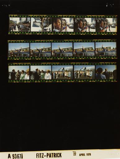 | Keywords: Ford A9367 NLGRF photo contact sheet (1976-04-23)(Gerald Ford Library).jpg White House Photographic Office WHPO is housed at the Gerald R Ford Presidential Library a branch of the National Archives and Records Administration NARA <br/><br/> This file is a 200 dpi photo contact sheet having images from roll of film A9367 of the August 9 1974 - January 20 1977 Gerald R Ford White House Photographic Office Series A0001-A9999 and B0001-B2886 photographs <br/><br/> The date on the photo contact sheet is the date the roll of film was processed not necessarily the date the photographs were taken See table below for additional details 1976-04-23 Gerald R Ford Presidential Library Image http //www fordlibrarymuseum gov/library/whphotos/A9367_NLGRF jpg A9367_NLGRF jpg from http //www fordlibrarymuseum gov/library/whphotos/19760423whpo pdf White House Photographs April 23 1976 of the http //www fordlibrarymuseum gov/Library/whphotos/whpo asp White House Photographic Collection page White House Photographic Office WHPO - Fitz-Partick PD-USGov Institution Institution Gerald R Ford Presidential Library Table wikitable sortable + Photo contact sheet A9367 U S President Ford Administration Gerald R Ford Library Frame s Tone Subject proper Subject generic Names Geographic Location Photographer Date - 3-7 Color Campaign Trip to Indiana - Parade Through Downtown Evansville IN GRF standing in sunroof of limousine waving; others flanking vehicle and street; moving toward camera; Ford '76 poster on left of frames 5-7; all not in every frame GRF Secret Service; Pom Pom Girls Crowd Evansville IN Main Street Fitz-Partick 1976-04-23 - 8-12 Color Campaign Trip to Indiana - Parade Through Downtown Evansville IN GRF standing in sunroof of limousine waving; others flanking vehicle; large building in background GRF Secret Service; Crowd Evansville IN Downtown Fitz-Partick 1976-04-23 - 13-17 Color Campaign Trip to Indiana - Prior to Departure from Evansville IN to Atlanta Georgia greeting handshaking standing posing; various angles and distances; all not in every frame; Air Force One in background in frames 15-17 GRF Unidentified Men and Women Evansville IN Evansville-Dress Regional Airport Fitz-Partick 1976-04-23 Gerald R Ford Presidential Library and Museum-cooperation PD-USGov Contact sheets by the Ford White House April 1976 |