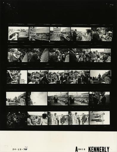 | Keywords: Ford A9416 NLGRF photo contact sheet (1976-04-29)(Gerald Ford Library).jpg White House Photographic Office WHPO is housed at the Gerald R Ford Presidential Library a branch of the National Archives and Records Administration NARA <br/><br/> This file is a 200 dpi photo contact sheet having images from roll of film A9416 of the August 9 1974 - January 20 1977 Gerald R Ford White House Photographic Office Series A0001-A9999 and B0001-B2886 photographs <br/><br/> The date on the photo contact sheet is the date the roll of film was processed not necessarily the date the photographs were taken See table below for additional details 1976-04-29 Gerald R Ford Presidential Library Image http //www fordlibrarymuseum gov/library/whphotos/A9416_NLGRF jpg A9416_NLGRF jpg from http //www fordlibrarymuseum gov/library/whphotos/19760429whpo pdf White House Photographs April 29 1976 of the http //www fordlibrarymuseum gov/Library/whphotos/whpo asp White House Photographic Collection page White House Photographic Office WHPO <br/> Creator David Hume Kennerly PD-USGov Institution Institution Gerald R Ford Presidential Library Table wikitable sortable + Photo contact sheet A9416 U S President Ford Administration Gerald R Ford Library Frame s Tone Subject proper Subject generic Names Geographic Location Photographer Date - 2-4 BW Primary Campaign Trip to Texas-Parade in Honor of GRF Unveiling Ceremony for Montgomery County Texas War Memorial Park GRF Tower standing in sunroof waving to crowd limousine driving past Keep Right sign GRF Sen John Tower Crowd Conroe TX streets of Conroe Kennerly 1976-04-29 - 5-15 BW Primary Campaign Trip to Texas-Unveiling Ceremony for Montgomery County Texas War Memorial Park-Arriving for GRF working crowd at rope; kissing girls in cowgirl and majorette costumes waving reaching GRF girls Crowd Secret Service Conroe TX Montgomery County Texas War Memorial Park Kennerly 1976-04-29 - 12-16 BW Primary Campaign Trip to Texas-Unveiling Ceremony for Montgomery County Texas War Memorial Park-Remarks GRF at podium; various angles and distances; balloons rising in frame 14 GRF Crowd Secret Service Conroe TX Montgomery County Texas War Memorial Park Kennerly 1976-04-29 - 17-18 BW Primary Campaign Trip to Texas-Reception for PFC Staff Volunteers and Families handshaking outside while arriving and departing; handshaking indoors at reception GRF Crowd Staff Conroe TX Outside and Inside Holiday Inn Kennerly 1976-04-29 - 19-22 BW Primary Campaign Trip to Texas-Airport Departure GRF greets family on tarmac; 24-25 Mosbacher stands by GRF Unidentified Family Robert Mosbacher Houston TX Houston Intercontinental Airport Kennerly 1976-04-29 Gerald R Ford Presidential Library and Museum-cooperation PD-USGov Contact sheets by the Ford White House April 1976 Photographs by David Hume Kennerly from 1976 |