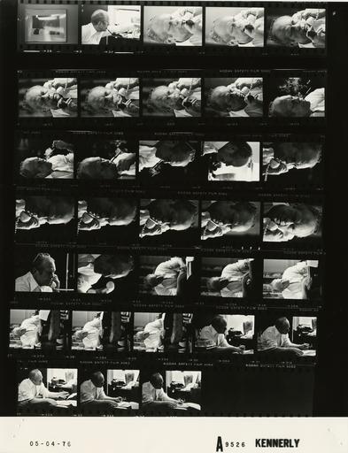 | Keywords: Ford A9526 NLGRF photo contact sheet (1976-05-04)(Gerald Ford Library).jpg White House Photographic Office WHPO is housed at the Gerald R Ford Presidential Library a branch of the National Archives and Records Administration NARA <br/><br/> This file is a 200 dpi photo contact sheet having images from roll of film A9526 of the August 9 1974 - January 20 1977 Gerald R Ford White House Photographic Office Series A0001-A9999 and B0001-B2886 photographs <br/><br/> The date on the photo contact sheet is the date the roll of film was processed not necessarily the date the photographs were taken See table below for additional details 1976-05-04 Gerald R Ford Presidential Library Image http //www fordlibrarymuseum gov/library/whphotos/A9526_NLGRF jpg A9526_NLGRF jpg from http //www fordlibrarymuseum gov/library/whphotos/19760504whpo pdf White House Photographs May 4 1976 of the http //www fordlibrarymuseum gov/Library/whphotos/whpo asp White House Photographic Collection page White House Photographic Office WHPO <br/> Creator David Hume Kennerly PD-USGov Institution Institution Gerald R Ford Presidential Library Table wikitable sortable + Photo contact sheet A9526 U S President Ford Administration Gerald R Ford Library Frame s Tone Subject proper Subject generic Names Geographic Location Photographer Date - 2A BW President's Private Study; photograph hanging on wall framed signed photograph of Egyptian President Anwar Sadat Second Floor - President's Private Study Kennerly 1976-05-04 - 3A-23A BW Receiving Telephoned Reports on Indiana and Georgia Primaries seated talking on telephone; glasses propped on forehead in shirtsleeves; close ups GRF Second Floor - President's Private Study Kennerly 1976-05-04 - 24A-34A BW Watching Television Reports on Indiana and Georgia Primaries seated at small desk writing; glasses propped on forehead in shirtsleeves; close ups GRF Second Floor - President's Private Study Kennerly 1976-05-04 Gerald R Ford Presidential Library and Museum-cooperation PD-USGov Contact sheets by the Ford White House May 1976 Photographs by David Hume Kennerly from 1976 |
