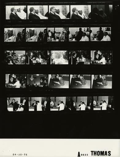 | Keywords: Ford A9620 NLGRF photo contact sheet (1976-04-30)(Gerald Ford Library).jpg White House Photographic Office WHPO is housed at the Gerald R Ford Presidential Library a branch of the National Archives and Records Administration NARA <br/><br/> This file is a 200 dpi photo contact sheet having images from roll of film A9620 of the August 9 1974 - January 20 1977 Gerald R Ford White House Photographic Office Series A0001-A9999 and B0001-B2886 photographs <br/><br/> The date on the photo contact sheet is the date the roll of film was processed not necessarily the date the photographs were taken See table below for additional details 1976-04-30 Gerald R Ford Presidential Library Image http //www fordlibrarymuseum gov/library/whphotos/A9620_NLGRF jpg A9620_NLGRF jpg from http //www fordlibrarymuseum gov/library/whphotos/19760430whpo pdf White House Photographs April 30 1976 of the http //www fordlibrarymuseum gov/Library/whphotos/whpo asp White House Photographic Collection page White House Photographic Office WHPO - Thomas PD-USGov Institution Institution Gerald R Ford Presidential Library Table wikitable sortable + Photo contact sheet A9620 U S President Ford Administration Gerald R Ford Library Frame s Tone Subject proper Subject generic Names Geographic Location Photographer Date - 4-8 BW SecState Trip to Africa; State Dinner in Honor of Sec Kissinger hosted by Liberian President William T Tolbert Jr ; Reception seated together on sofa talking close-up Kissinger William T Tolbert Jr Monrovia Liberia Africa Executive Mansion Thomas 1976-04-30 - 9-19 BW SecState Trip to Africa-State Dinner in Honor of Sec Kissinger hosted by Liberian President William T Tolbert Jr arriving at set dinner tables; Kissinger and Tolbert seated talking; standing toasting; and embracing; Kissinger William T Tolbert Jr Others Monrovia Liberia Africa Executive Mansion Thomas 1976-04-30 - 20 BW SecState Trip to Africa-State Dinner in Honor of Sec Kissinger hosted by Liberian President William T Tolbert Jr -Kissinger Remarks re Angola and Cuba Kissinger at podium making remarks; long view Kissinger William T Tolbert Jr Others Monrovia Liberia Africa Executive Mansion Thomas 1976-04-30 - 21-23 BW SecState Trip to Africa-State Dinner in Honor of Sec Kissinger hosted by Liberian President William T Tolbert Jr -Kissinger Remarks re Angola and Cuba; US Ambassador to Liberia seated at table listening intently smoking cigar; close up Amb W Beverly Carter Monrovia Liberia Africa Executive Mansion Thomas 1976-04-30 - 24-28 BW SecState Trip to Africa-State Dinner in Honor of Sec Kissinger hosted by Liberian President William T Tolbert Jr -Kissinger Toast Kissinger at podium toasting Tolbert; both toasting standing embracing Kissinger William T Tolbert Jr Monrovia Liberia Africa Executive Mansion Thomas 1976-04-30 Gerald R Ford Presidential Library and Museum-cooperation PD-USGov Contact sheets by the Ford White House April 1976 1976 in Liberia |