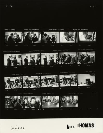| Keywords: Ford A9986 NLGRF photo contact sheet (1976-05-27)(Gerald Ford Library).jpg White House Photographic Office WHPO is housed at the Gerald R Ford Presidential Library a branch of the National Archives and Records Administration NARA <br/><br/> This file is a 200 dpi photo contact sheet having images from roll of film A9986 of the August 9 1974 - January 20 1977 Gerald R Ford White House Photographic Office Series A0001-A9999 and B0001-B2886 photographs <br/><br/> The date on the photo contact sheet is the date the roll of film was processed not necessarily the date the photographs were taken See table below for additional details 1976-05-27 Gerald R Ford Presidential Library Image http //www fordlibrarymuseum gov/library/whphotos/A9986_NLGRF jpg A9986_NLGRF jpg from http //www fordlibrarymuseum gov/library/whphotos/19760527whpo pdf White House Photographs May 27 1976 of the http //www fordlibrarymuseum gov/Library/whphotos/whpo asp White House Photographic Collection page White House Photographic Office WHPO - Thomas PD-USGov Institution Institution Gerald R Ford Presidential Library Table wikitable sortable + Photo contact sheet A9986 U S President Ford Administration Gerald R Ford Library Frame s Tone Subject proper Subject generic Names Geographic Location Photographer Date - 4A-6A BW Meeting to Discuss the Administrations Motor Carrier Reform Proposal with North Carolina Trucking Officials standing talking GRF Unidentified Men Cannon Cabinet Room Thomas 1976-05-27 - 7A-8A BW CEA Chairman Alan Greenspan Returning to White House from Tennis Courts climbing steps to colonnade in shorts carrying tennis rackets Greenspan Unidentified Man Colonnade Thomas 1976-05-27 - 9A-17A BW Farewell visit with Departing Ambassador of Liberia to the US standing handshaking; seated in chairs by fireplace GRF Amb S Edward Peal Oval Office Thomas 1976-05-27 - 18A BW Unidentified Desk Thomas 1976-05-27 - 19A-22A BW Viewing PFC Primary Campaign Television Commericials; PFC DepChrm for Political Organization Spencer; Director's Circle film director Herriot greeting seated at table watching television not shown GRF Don Penny Schneider Paul Herriot Stuart Spencer Cheney Raoul-Duval; Kennerly Nessen Cabinet Room Thomas 1976-05-27 Gerald R Ford Presidential Library and Museum-cooperation PD-USGov Contact sheets by the Ford White House May 1976 |